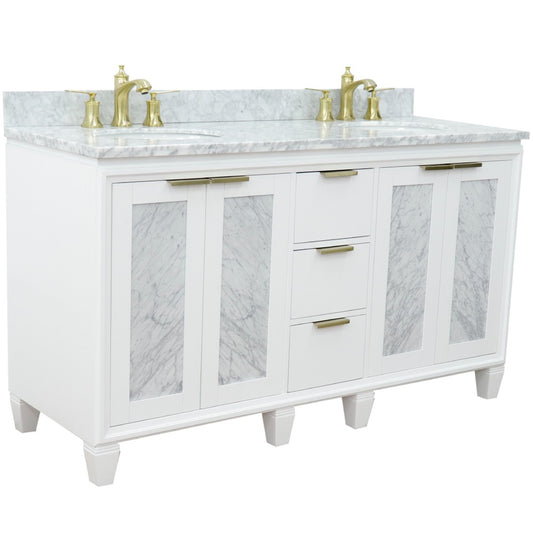 61" Double sink vanity in White finish with White Carrara marble and oval sink