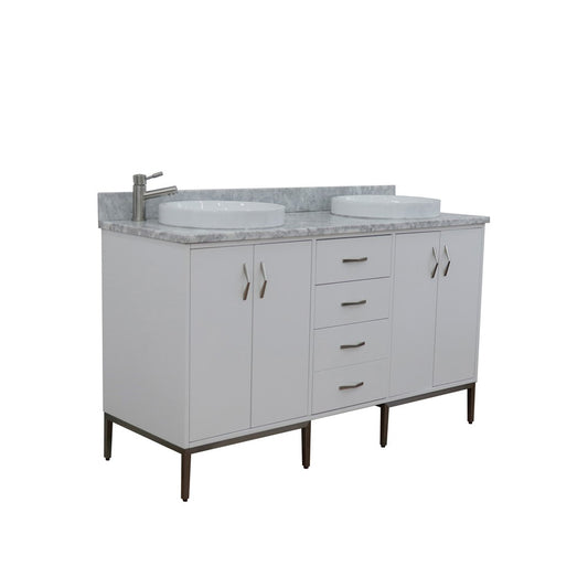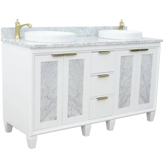 61" Double sink vanity in White finish with White Carrara marble and round sink