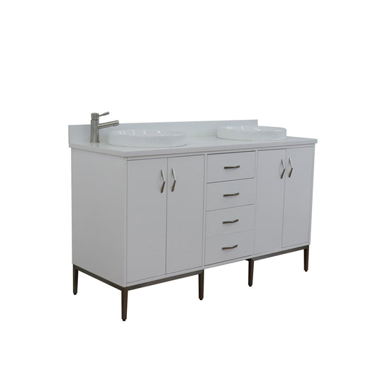 61" Double sink vanity in White finish with White engineered stone and round sink