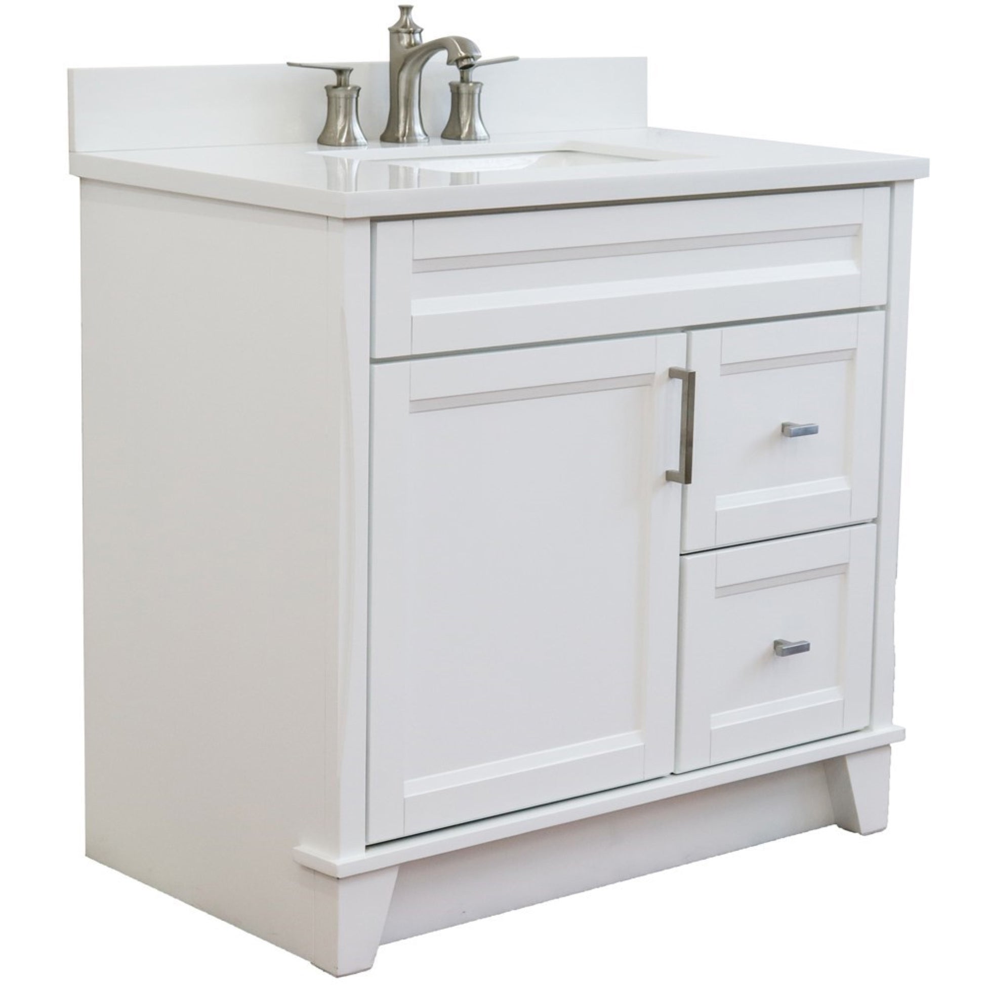 37" Single sink vanity in White finish with White engineered stone and Left door/Center sink