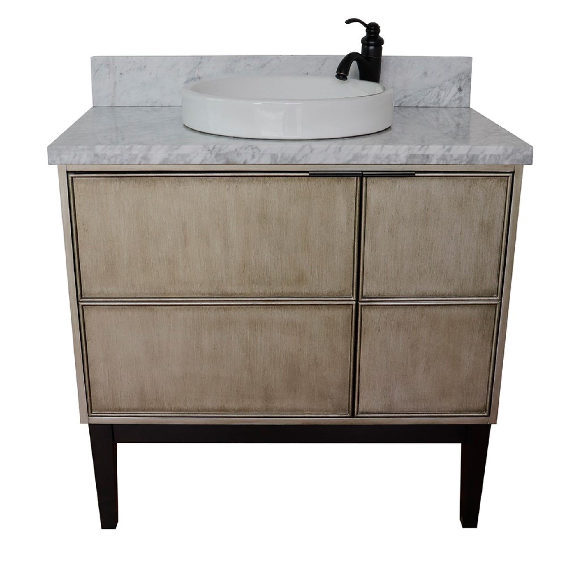 37" Single vanity in Linen Brown finish with White Carrara top and round sink