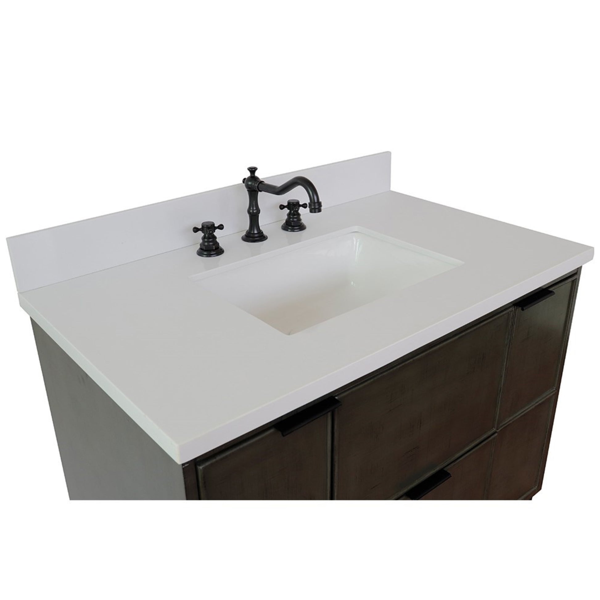 37" Single wall mount vanity in Linen Gray finish with White engineered stone top and rectangle sink