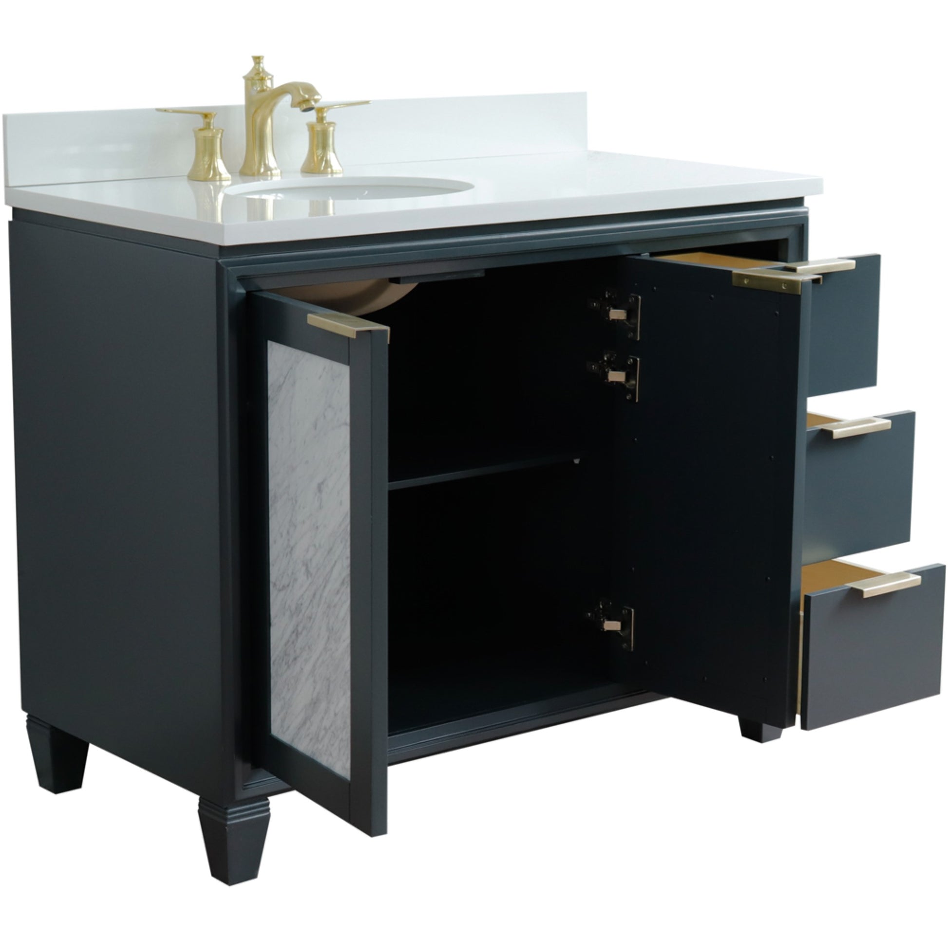 43" Single vanity in Dark Gray finish with White engineered stone and oval sink Left door/Left sink