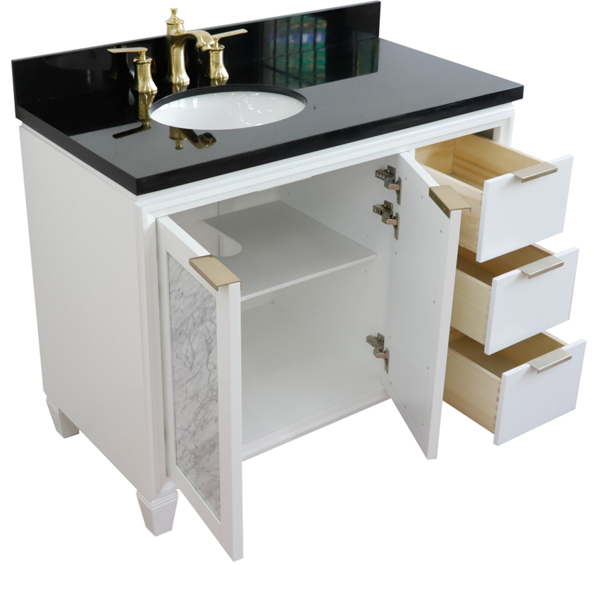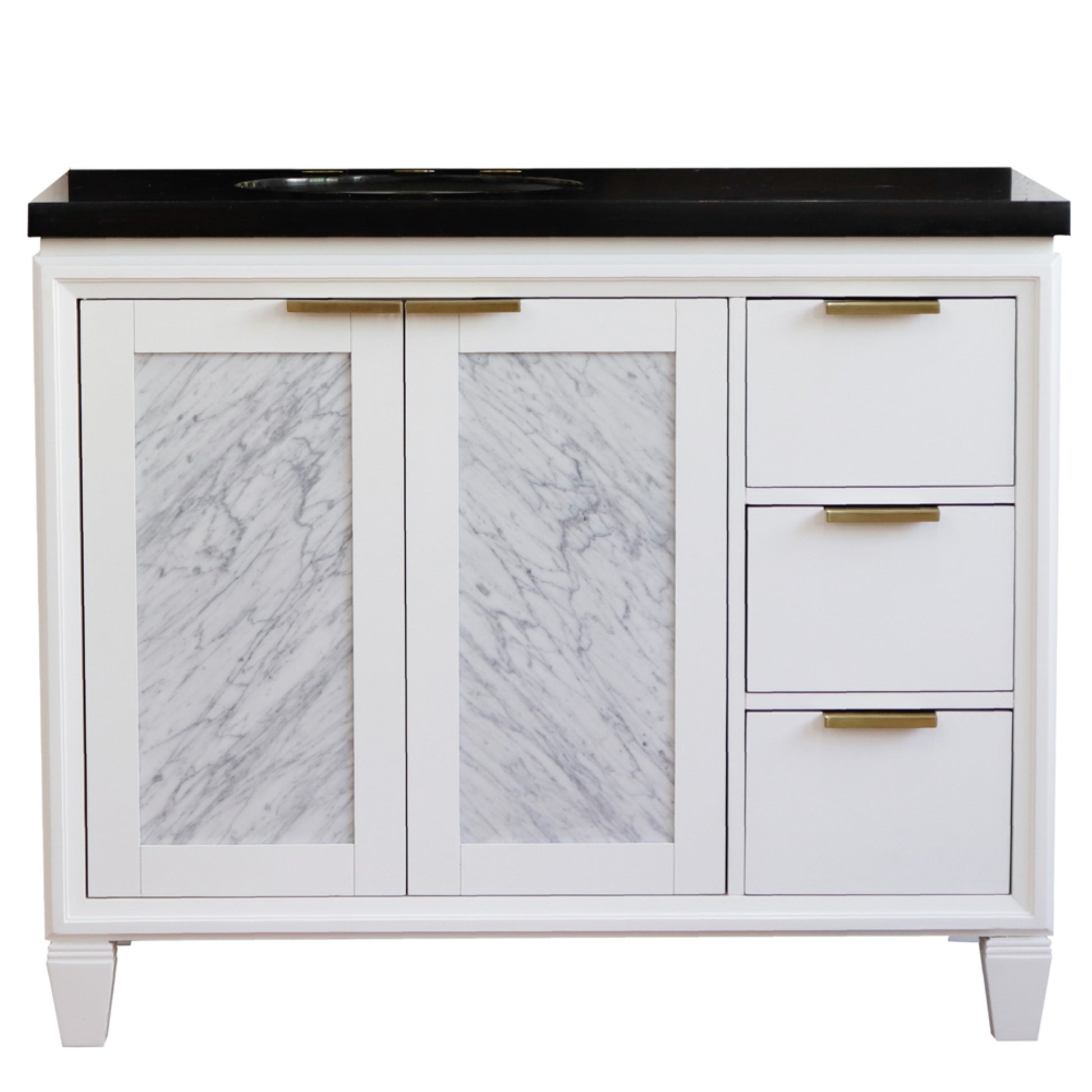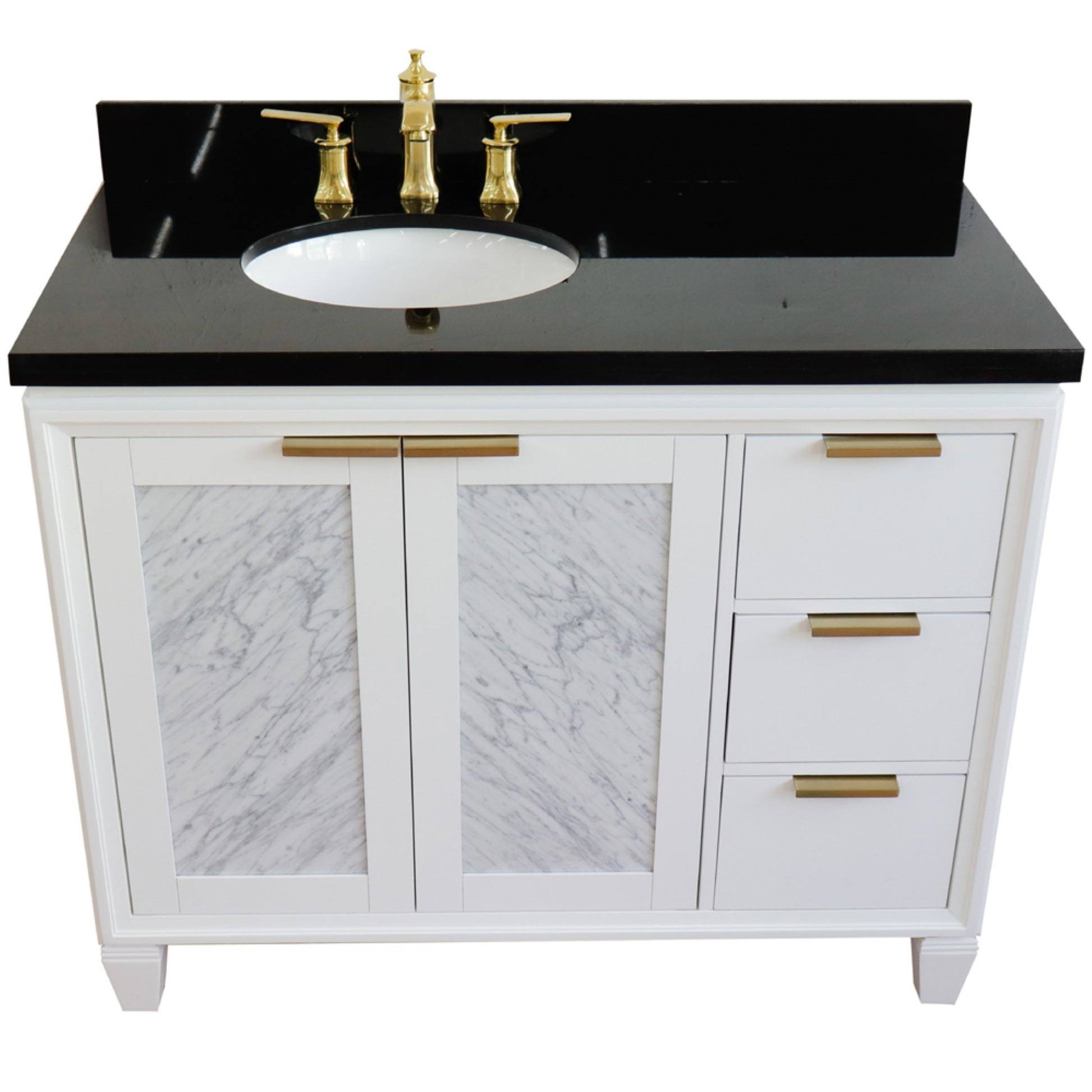 43" Single vanity in White finish with Black galaxy and oval sink Left door/Left sink