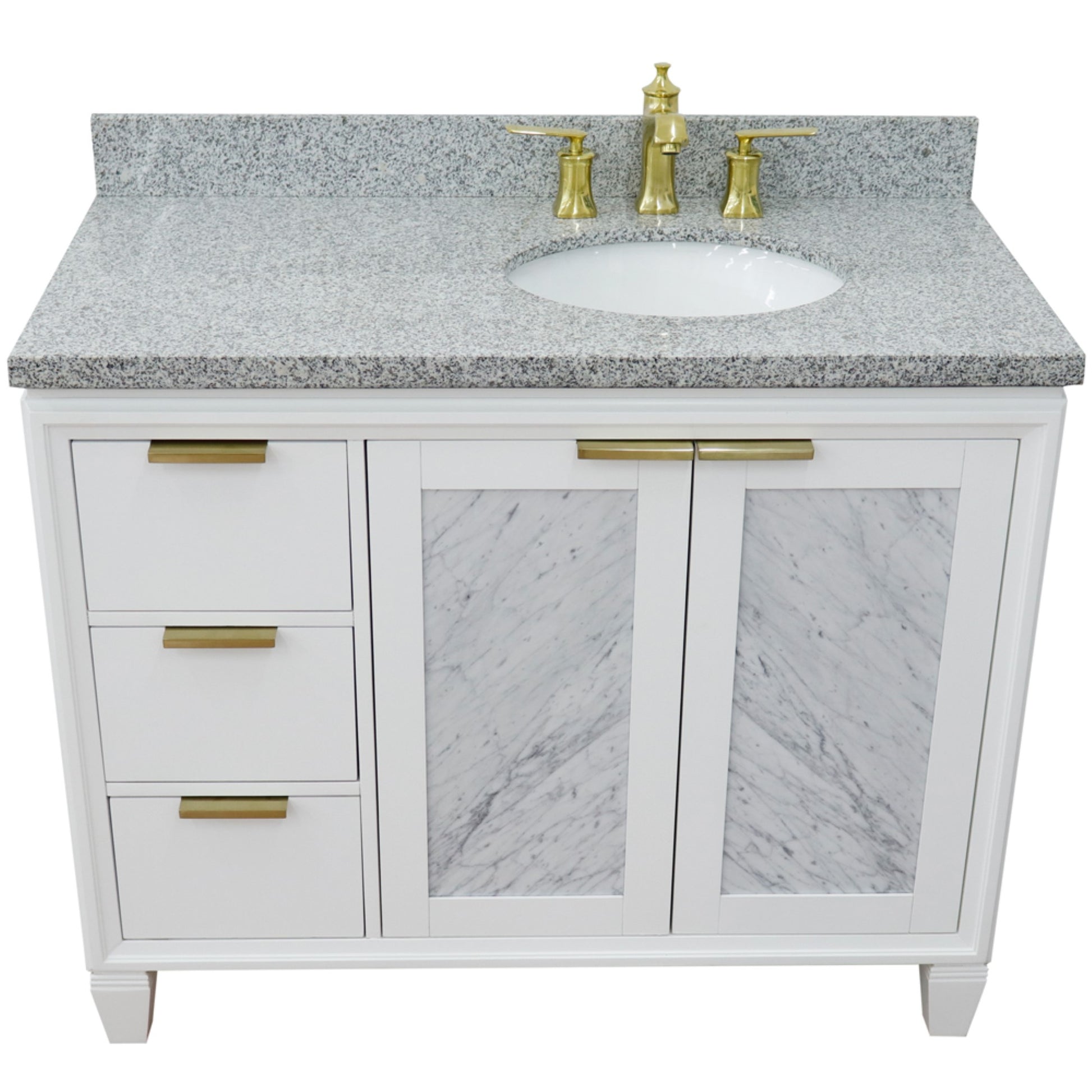43" Single vanity in White finish with Gray granite and oval sink Right door/Right sink