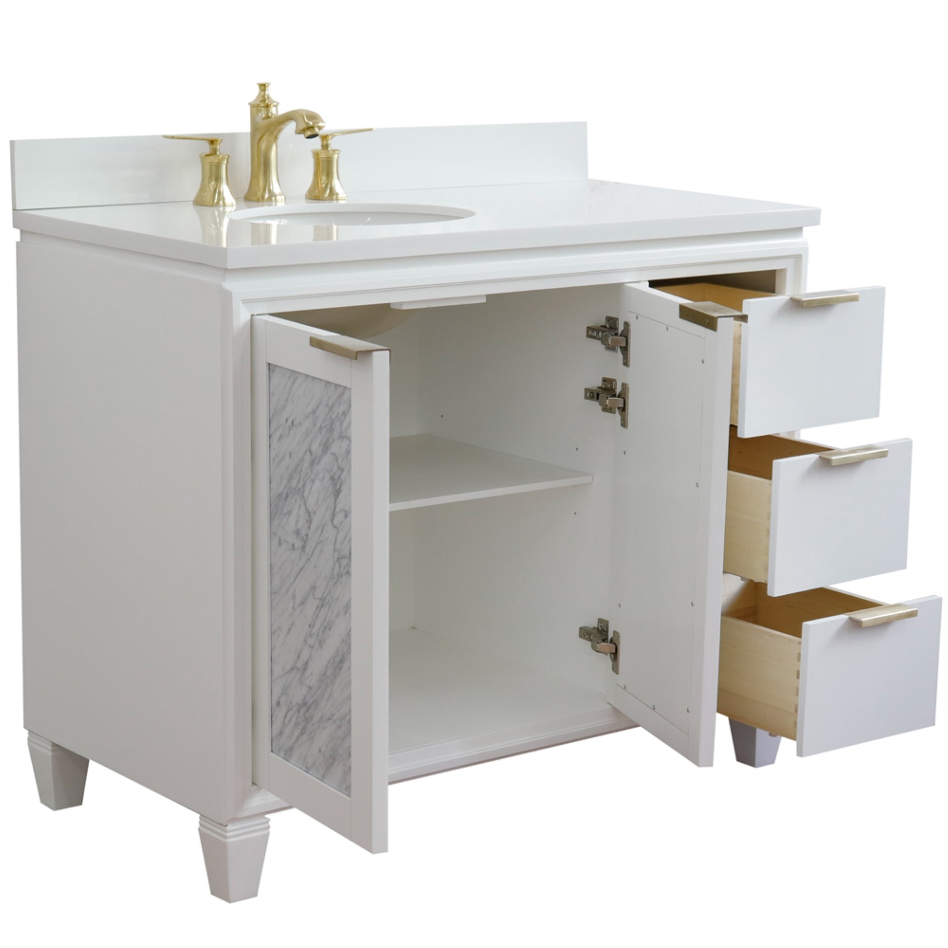 The Trento collection by Bellaterra Home features freestanding style bathroom vanities that can integrate seamlessly with any home design. From a simple or to the grand home design, you will appreciate this beautifully crafted piece of furniture as the focal point in your bathroom. The structure of the cabinet is built with solid oak. The vanity has three drawers and four cabinet doors that open to a large ample storage space. The drawers are constructed with English dovetail and are installed with smooth full extension glides to provide durability. The doors have genuine Italian Carrara marble inserts which make this vanity simply more elegant. This vanity features gold finish hardware and bathroom vanity top is preinstalled with white cUPC certified ceramic sink and a beautiful counter top that is pre-sealed and polished for added protection.