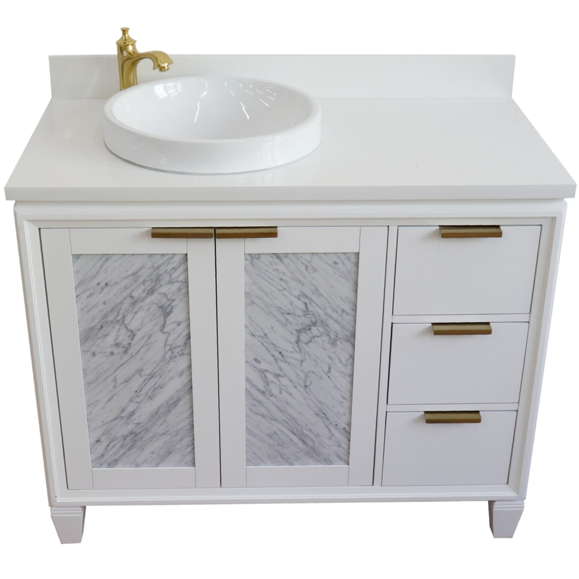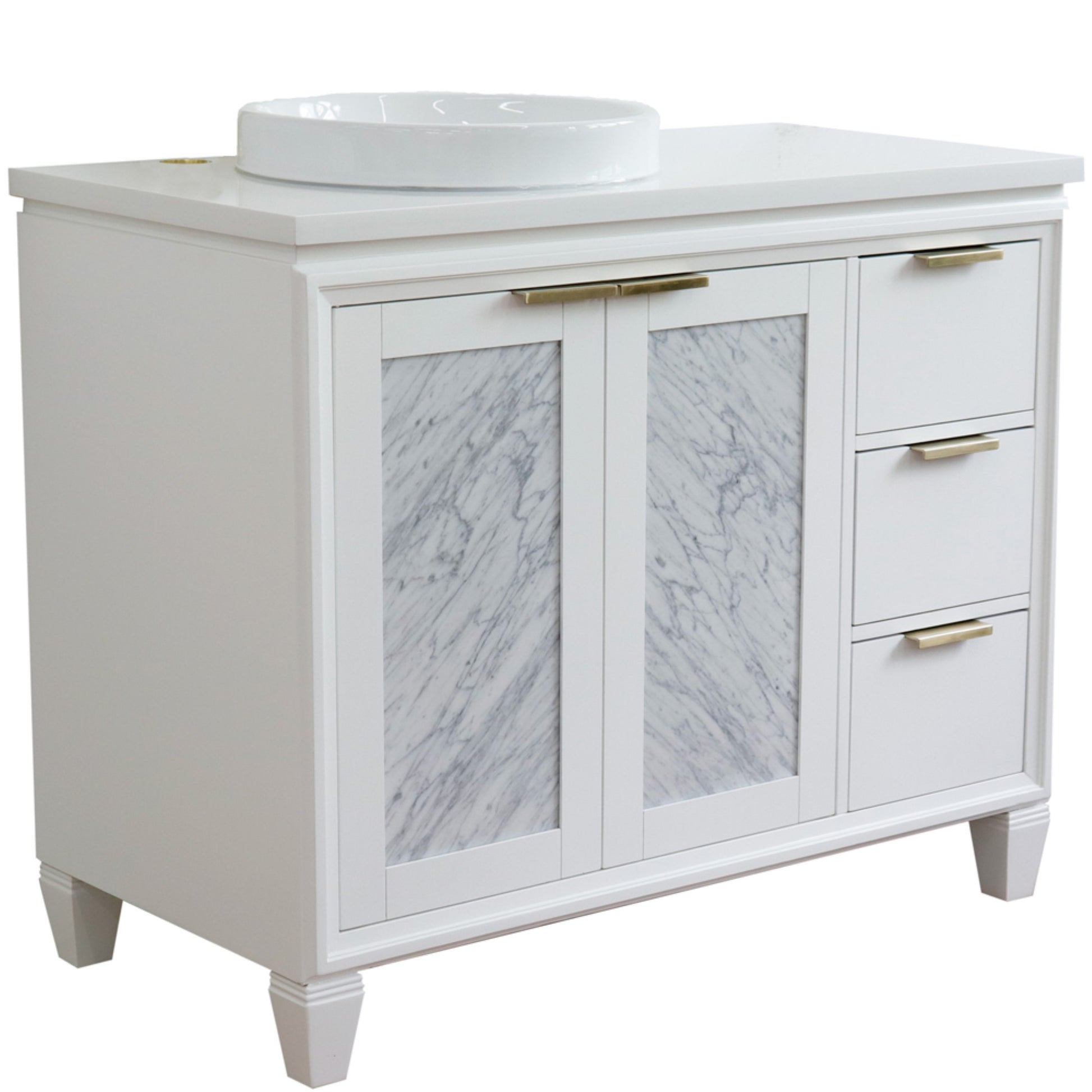 43" Single vanity in White finish with White engineered stone and round sink Left door/Left sink