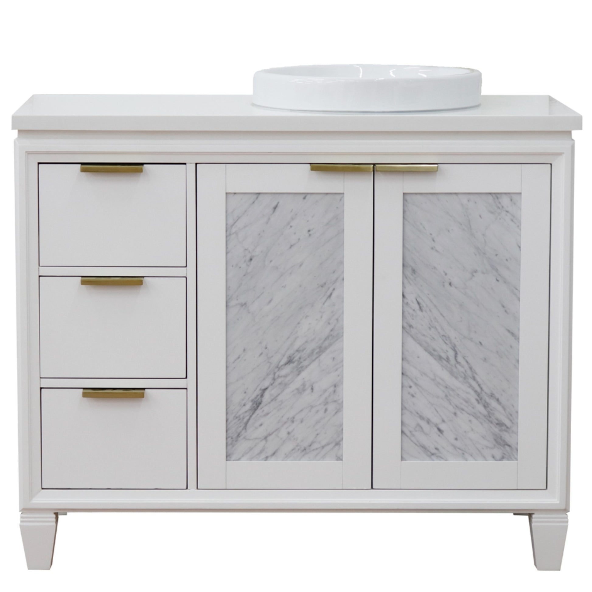43" Single vanity in White finish with White engineered stone and round sink Right door/Right sink