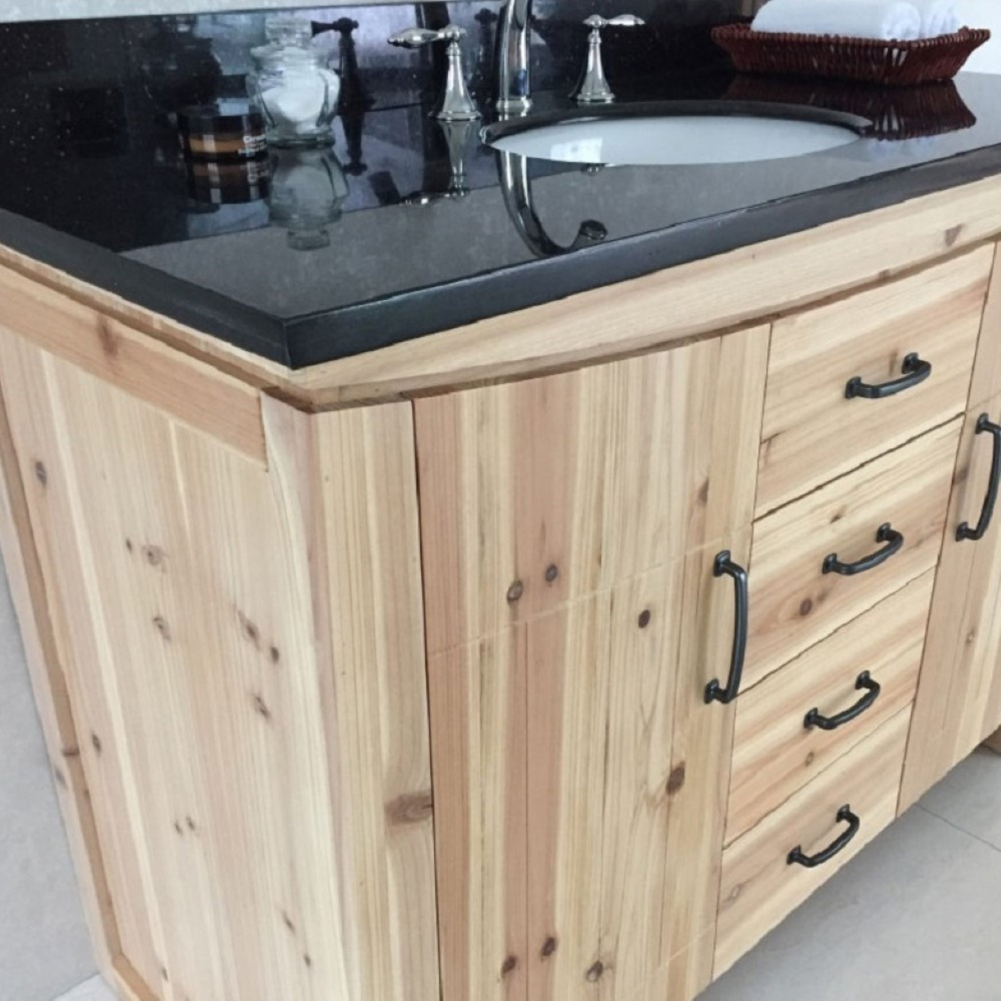 With this beautiful contemporary vanity in your home, your bathroom will feel like a spa! This style offers plenty of space for storage and the single sink is located in the center. It has 3 drawers and two cabinet doors for all your storage needs. The natural wood will gives off a wonderful calming and relaxing feel to your bathroom