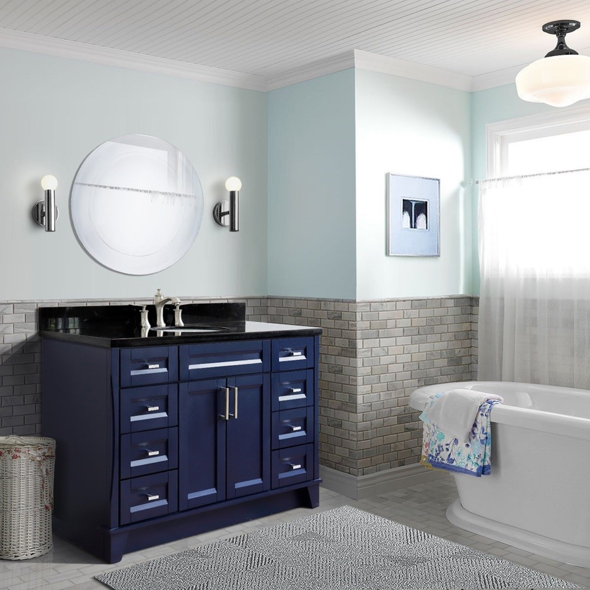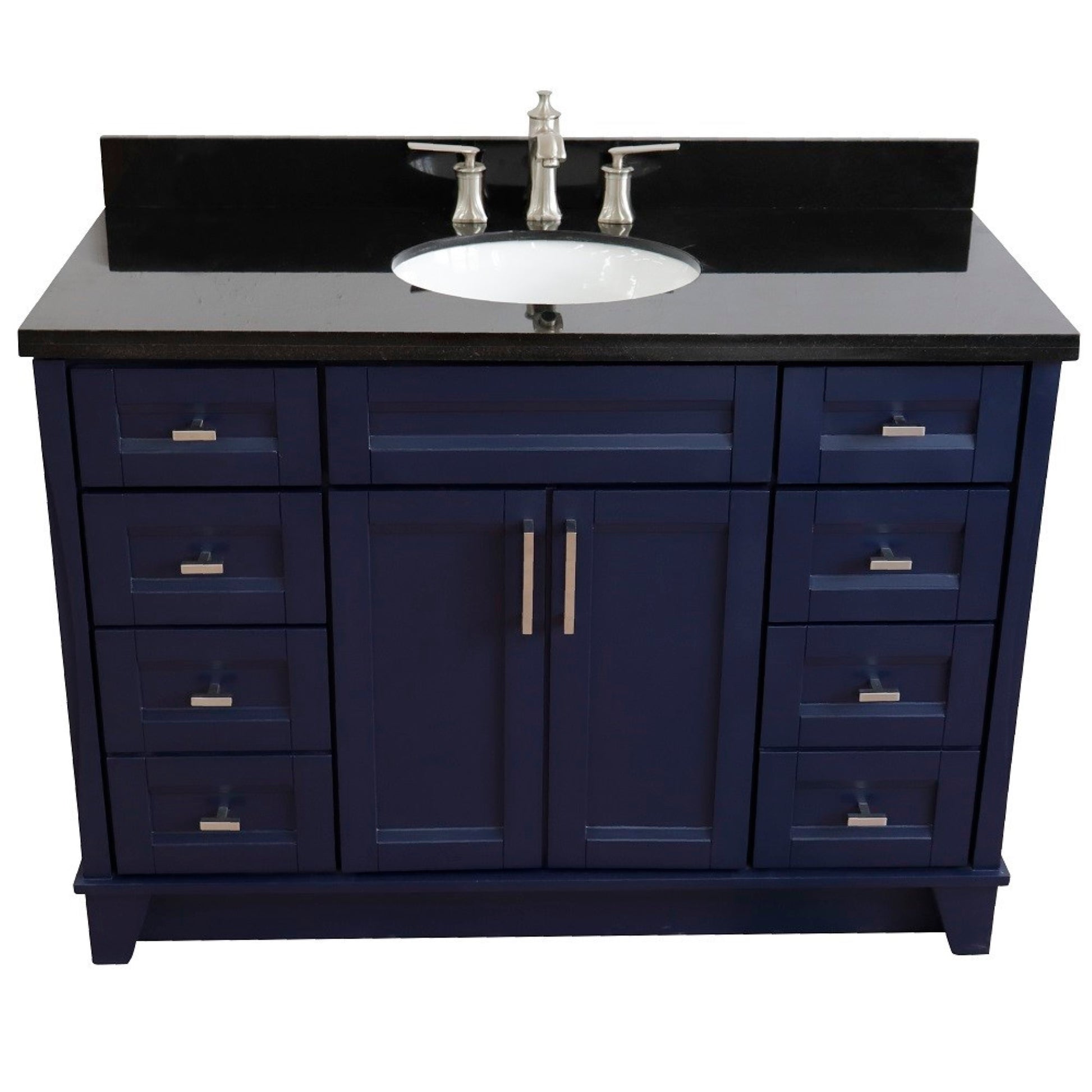 49" Single sink vanity in Blue finish with Black galaxy granite and oval sink