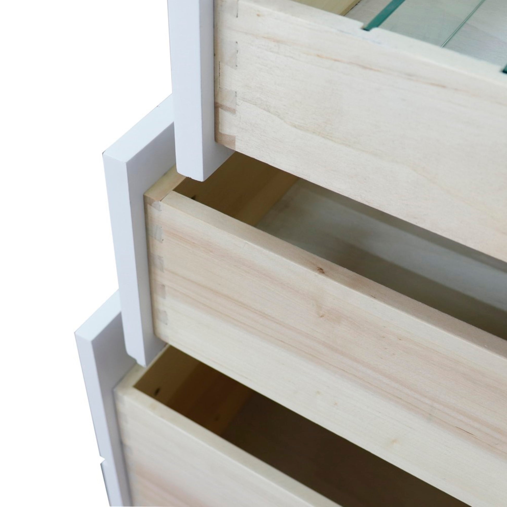 The Terni collection by Bellaterra Home features simple style bathroom vanities that can integrate seamlessly with any home design. From a simple or to the grand home design, you will appreciate this beautifully crafted piece of furniture as the focal point in your bathroom. The structure of the cabinet is built with solid oak. This vanity has six drawers and two cabinet doors that open to a large ample storage space. The drawers are constructed with English dovetail and are installed with smooth full extension glides to provide durability. This vanity features brushed nickel finish hardware and a beautiful counter top that is pre-sealed and polished for added protection. The bathroom vanity top is preinstalled with a white cUPC certified ceramic sink.