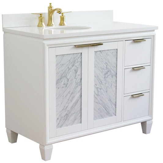 43" Single vanity in White finish with White engineered stone and oval sink Left door/Left sink