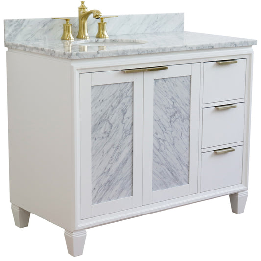 43" Single vanity in White finish with White Carrara and oval sink Left door/Left sink