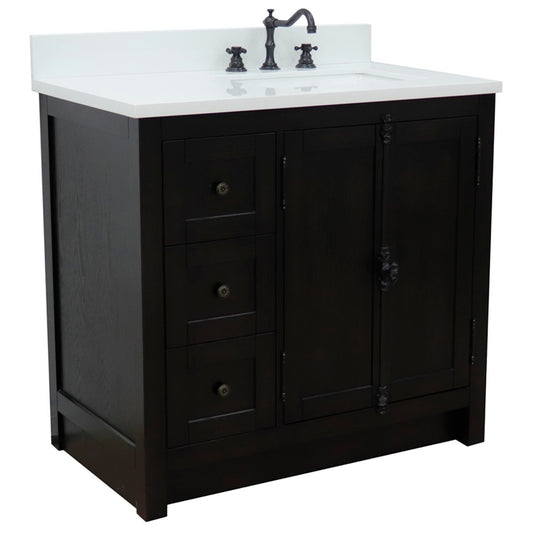 37" Single vanity in Brown Ash finish with White engineered stone top and rectangle sink Right doors/Right sink