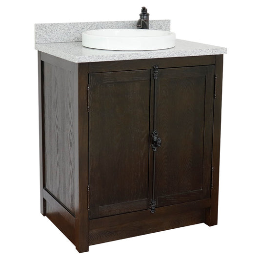 31" Single vanity in Brown Ash finish with Gray granite top and round sink