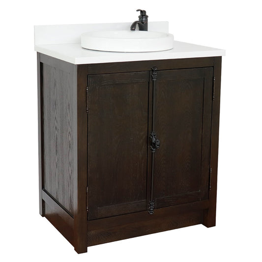 31" Single vanity in Brown Ash finish with White engineered stone top and round finish