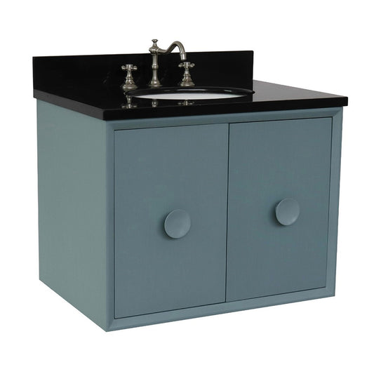 31" Single wall mount vanity in Aqua Blue finish with Black Galaxy top and oval sink
