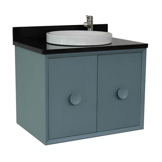 31" Single wall mount vanity in Aqua Blue finish with Black Galaxy top and round sink