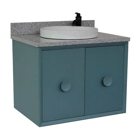 31" Single wall mount vanity in Aqua Blue finish with Gray granite top and round sink