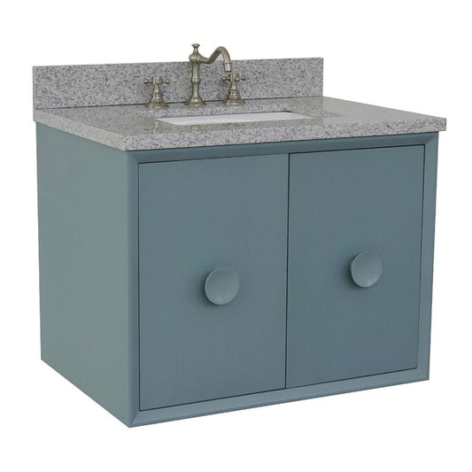 31" Single wall mount vanity in Aqua Blue finish with Gray granite top and rectangle sink