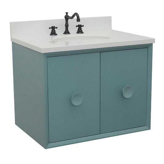 31" Single wall mount vanity in Aqua Blue finish with White engineered stone top and oval sink