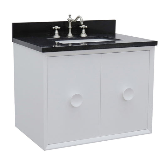 31" Single wall mount vanity in White finish with Black Galaxy top and rectangle sink