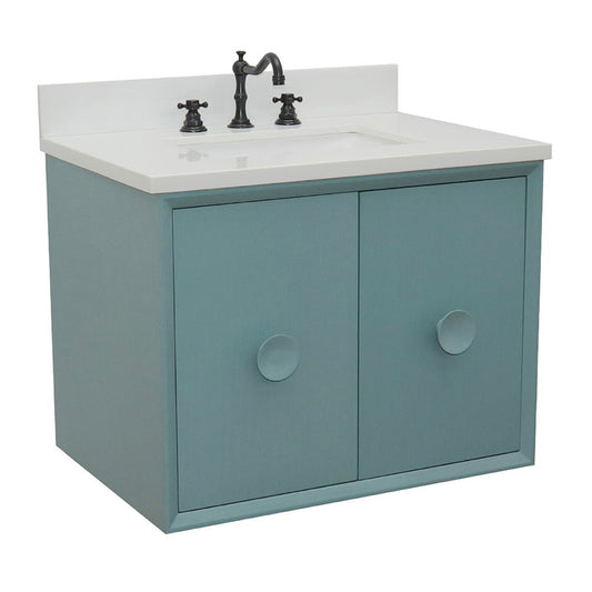 31" Single wall mount vanity in Aqua Blue finish with White engineered stone top and rectangle sink