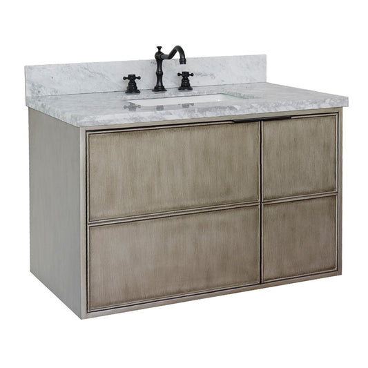 37" Single wall mount vanity in Linen Brown finish with White Carrara top and rectangle sink