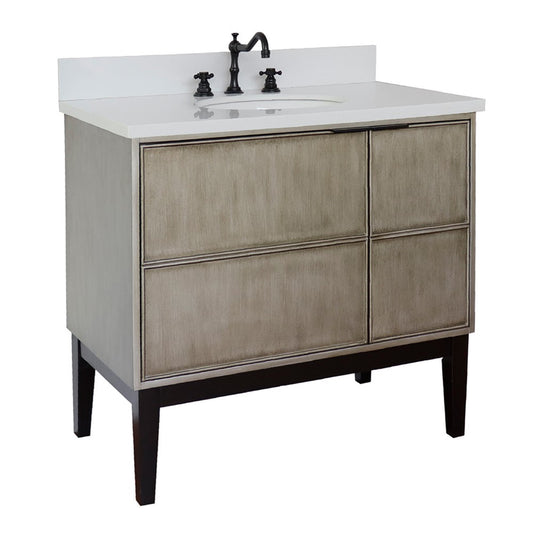 37" Single vanity in Linen Brown finish with White engineered stone top and oval sink