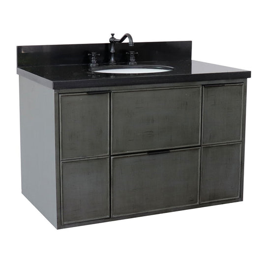 37" Single wall mount vanity in Linen Gray finish with Black Galaxy top and oval sink