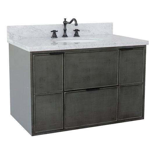 37" Single wall mount vanity in Linen Gray finish with White Carrara top and oval sink