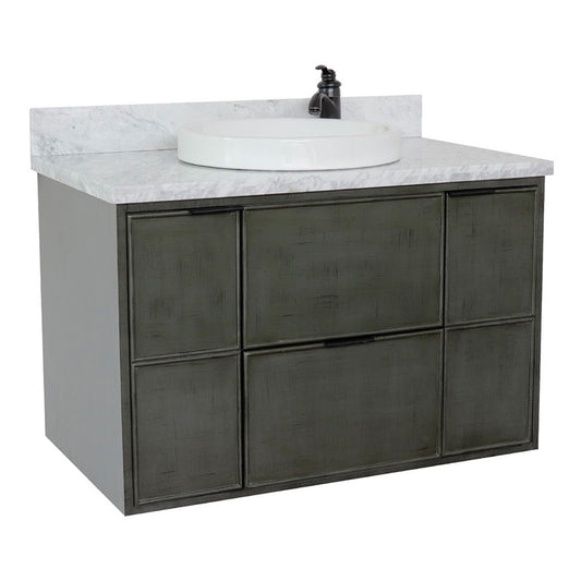 37" Single wall mount vanity in Linen Gray finish with White Carrara top and round sink