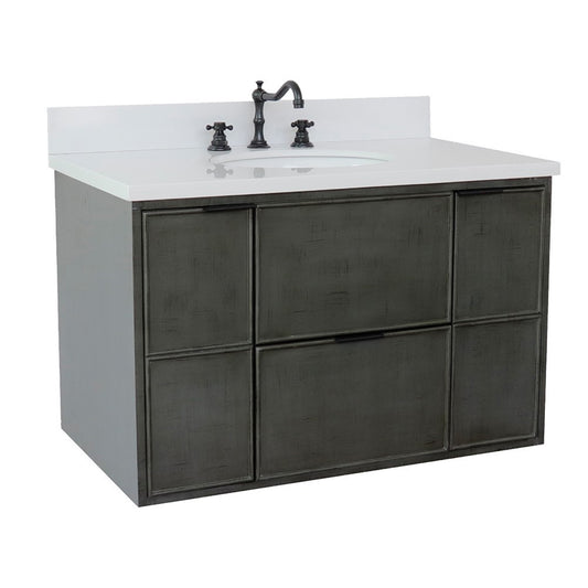37" Single wall mount vanity in Linen Gray finish with White engineered stone top and oval sink
