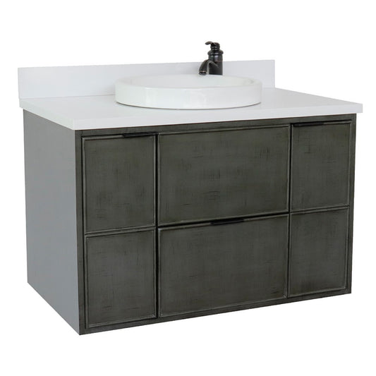37" Single wall mount vanity in Linen Gray finish with White engineered stone top and round sink