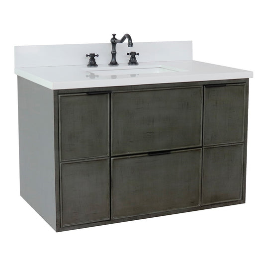 37" Single wall mount vanity in Linen Gray finish with White engineered stone top and rectangle sink