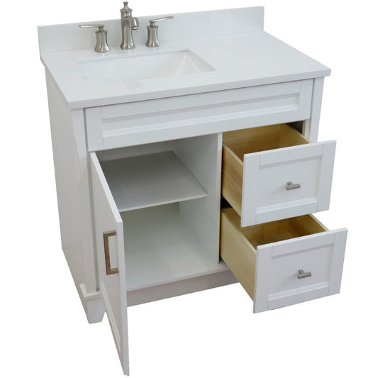 37" Single sink vanity in White finish with White engineered stone and Left door/Center sink