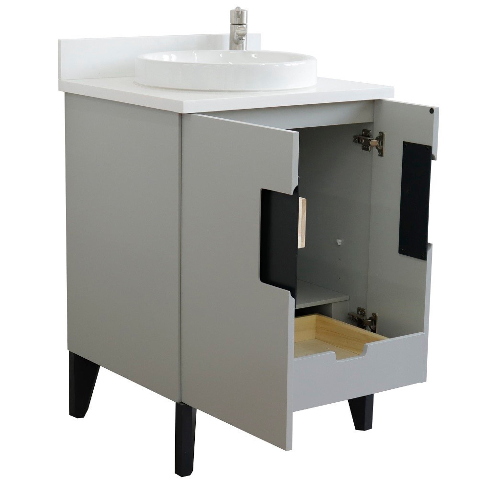 25" Single sink vanity in Light Gray finish with White engineered stone and round sink