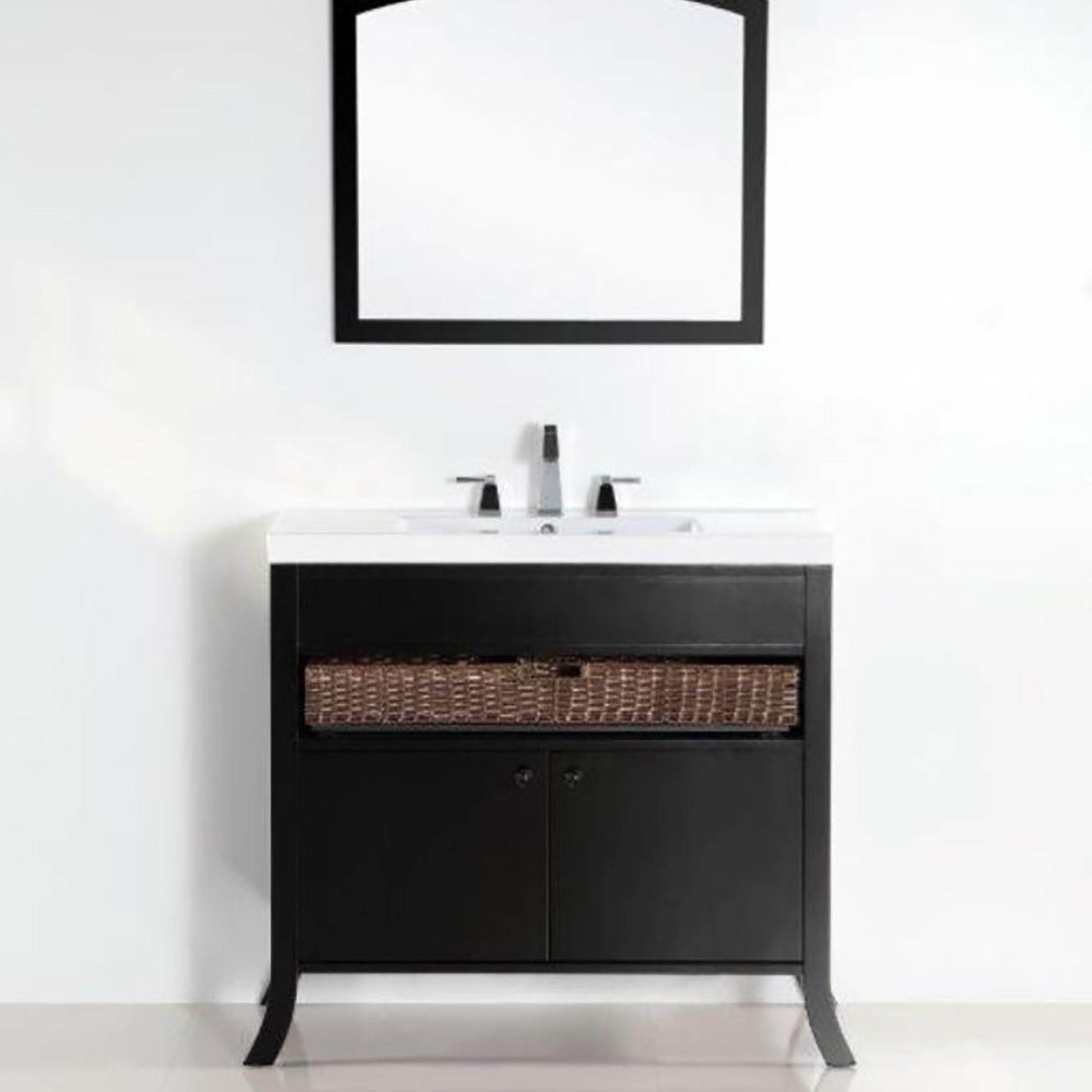 This free-standing style works well in half-baths or paired up opposite an identical one in larger powder rooms. The dark, rich espresso finish infuses a warm, welcoming ambience to any home. It is has a small full-extension basket makes storing small items easy and accessible. The double doors cabinet provides ample storage. It is constructed with solid wood and plywood and arched post-style legs punctuate the elegant styling of this modern vanity