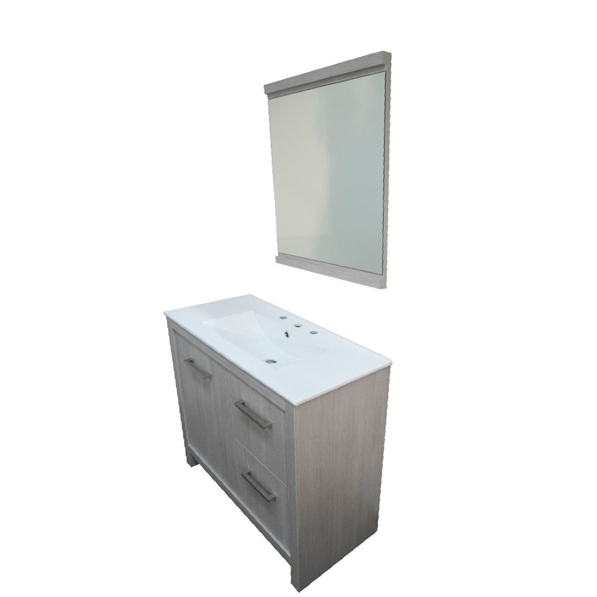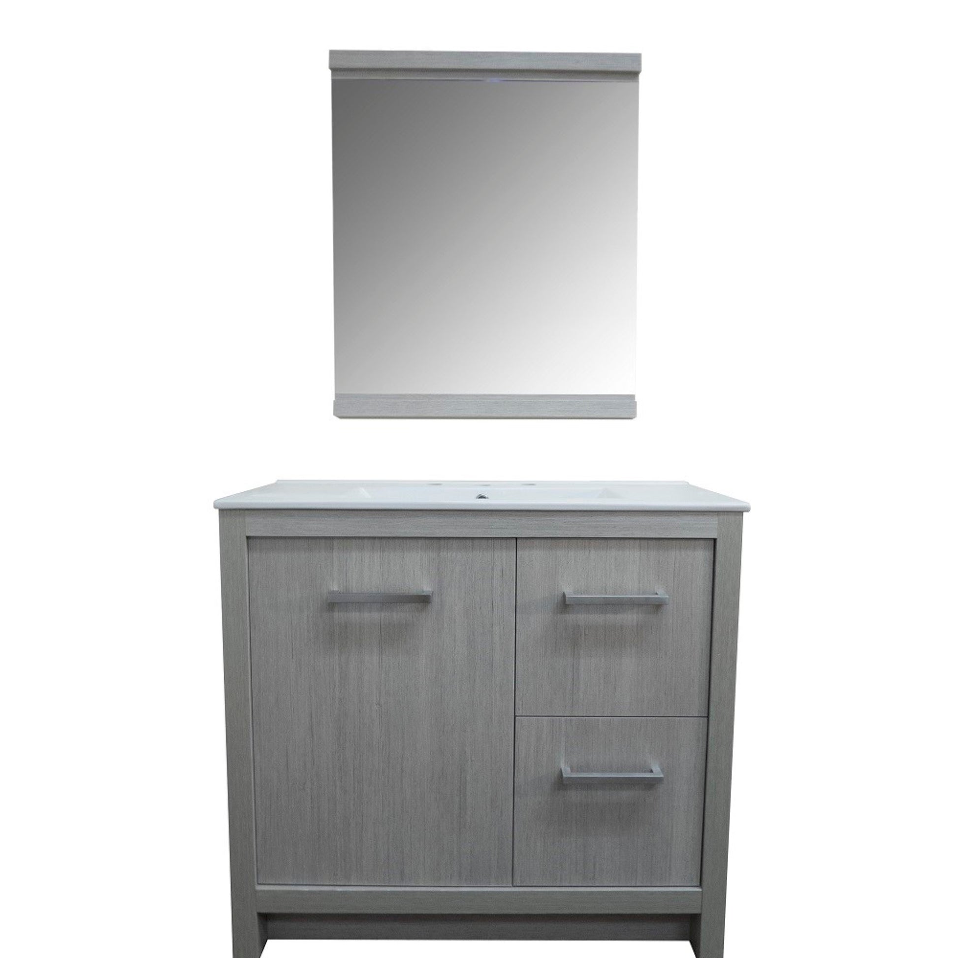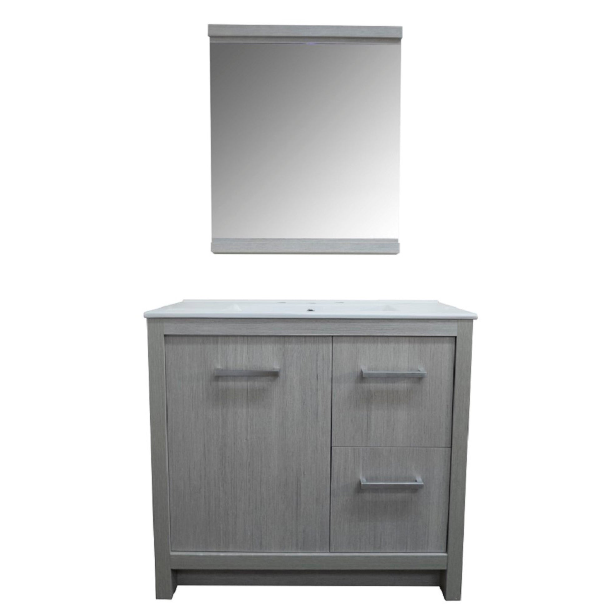 This 36". single sink bathroom Vanity is designed as a center piece to awe-inspire the eye without sacrificing quality, Functionality or stability. It is elegantly constructed of solid birch wood, finished in a gray pine color and equipped with integrated ceramic drop in basin. This stylish design includes two drawers and soft closing single door cabinet all adorned with satin nickel hardware. Dimensions: 35.3Wx18Dx32.5H