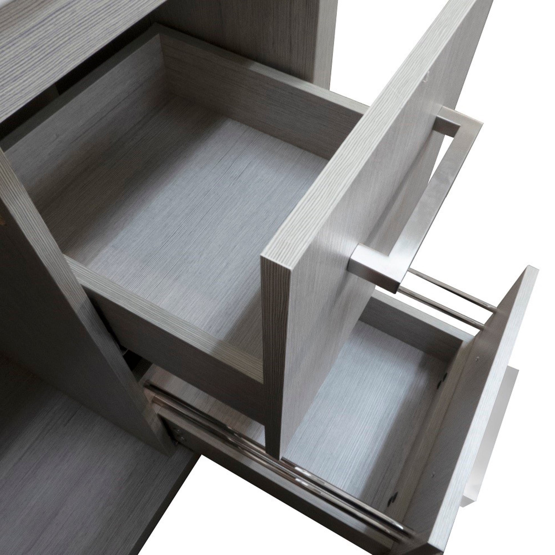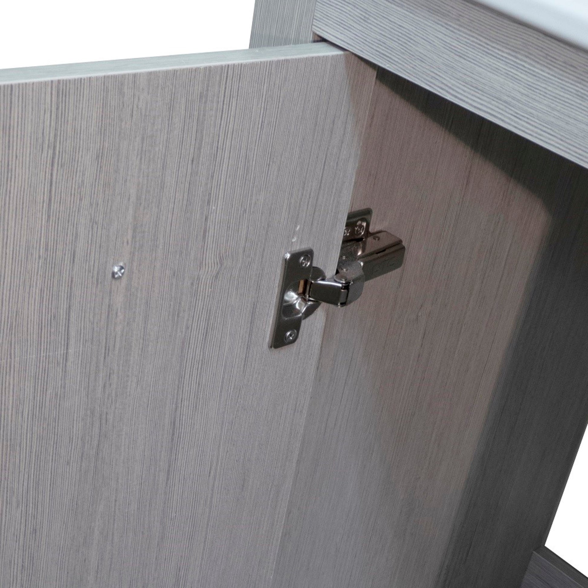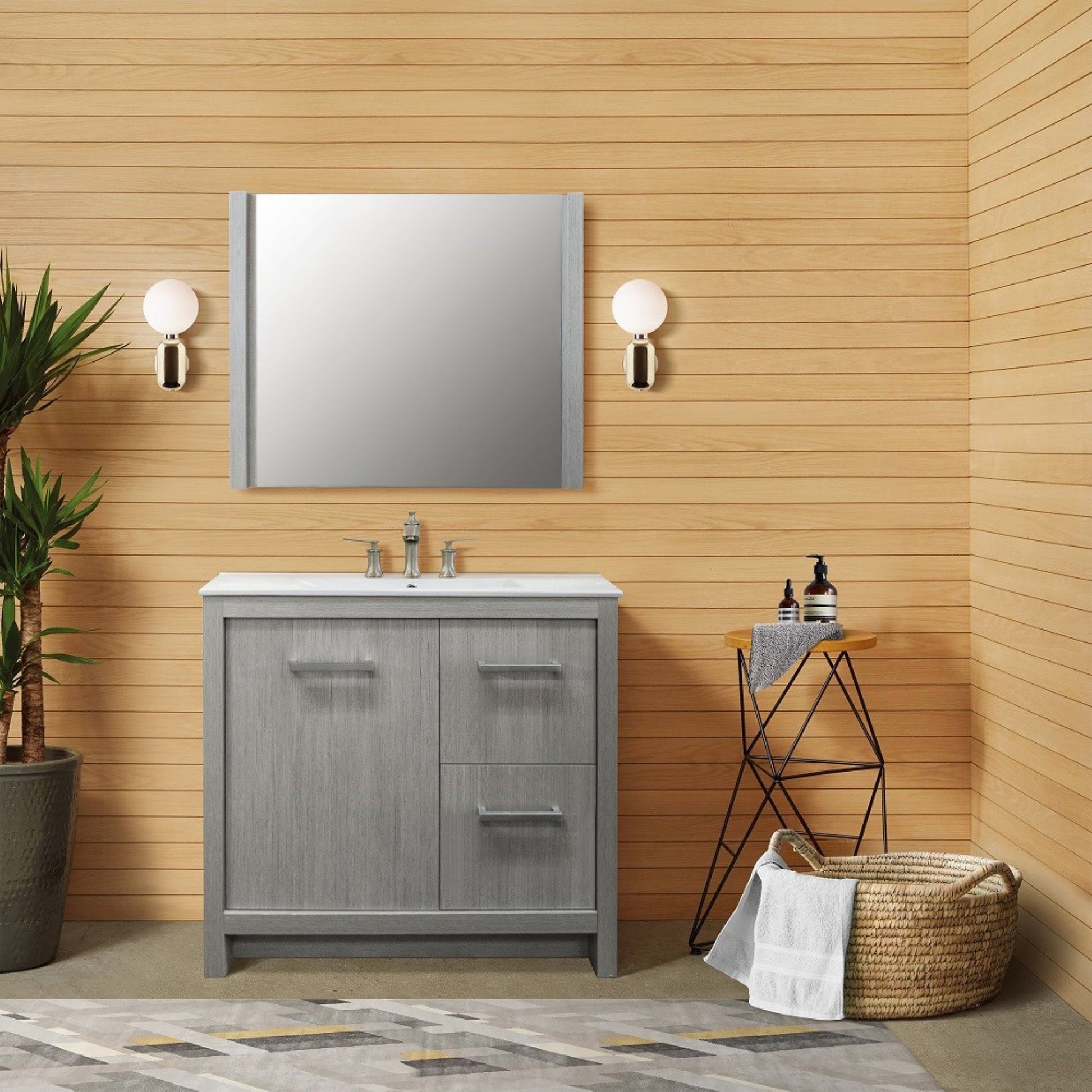 This 36". single sink bathroom Vanity is designed as a center piece to awe-inspire the eye without sacrificing quality, Functionality or stability. It is elegantly constructed of solid birch wood, finished in a gray pine color and equipped with integrated ceramic drop in basin. This stylish design includes two drawers and soft closing single door cabinet all adorned with satin nickel hardware. Dimensions: 35.3Wx18Dx32.5H