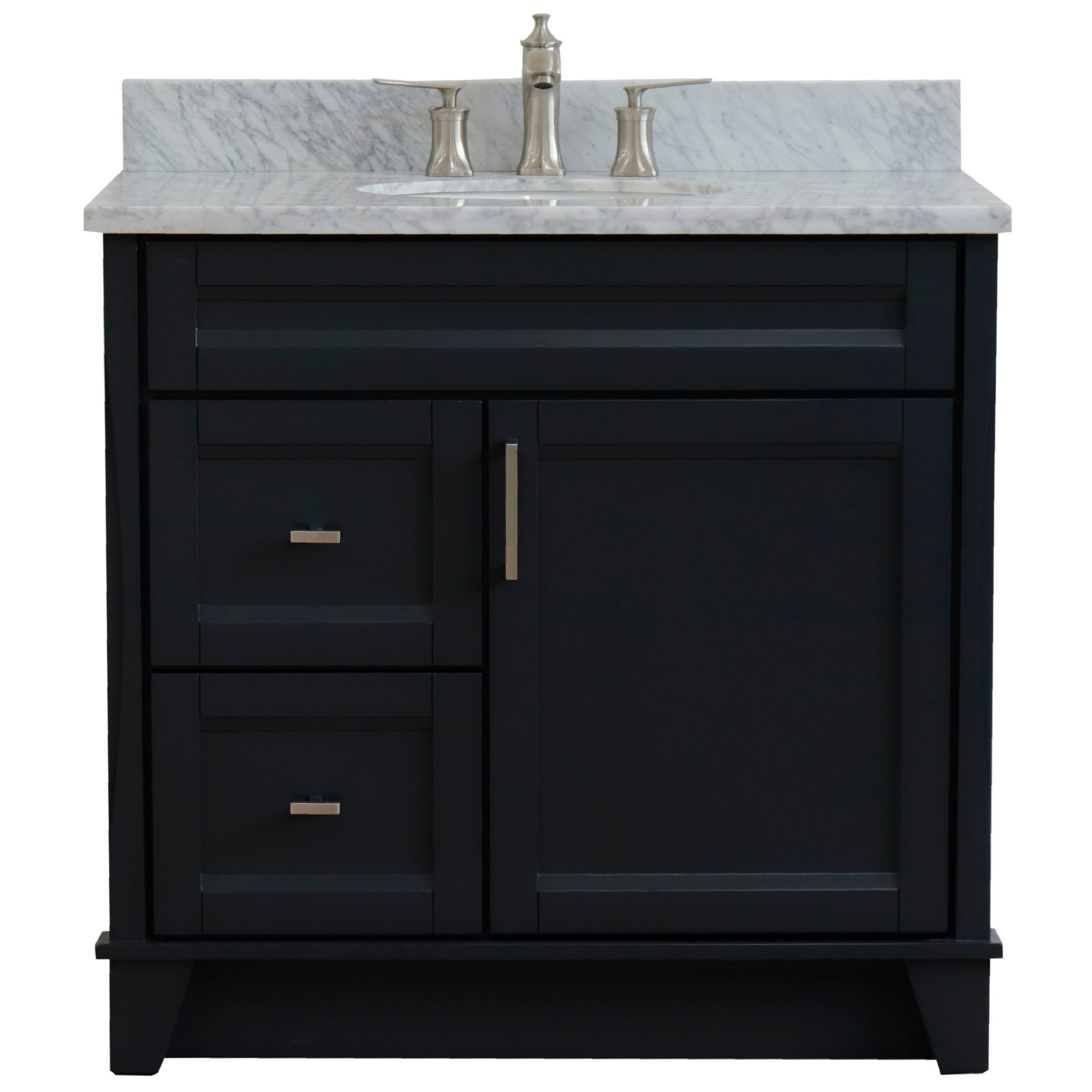 37" Single sink vanity in Dark Gray finish with White Carrara marble and CENTER oval sink RIGHT drawers