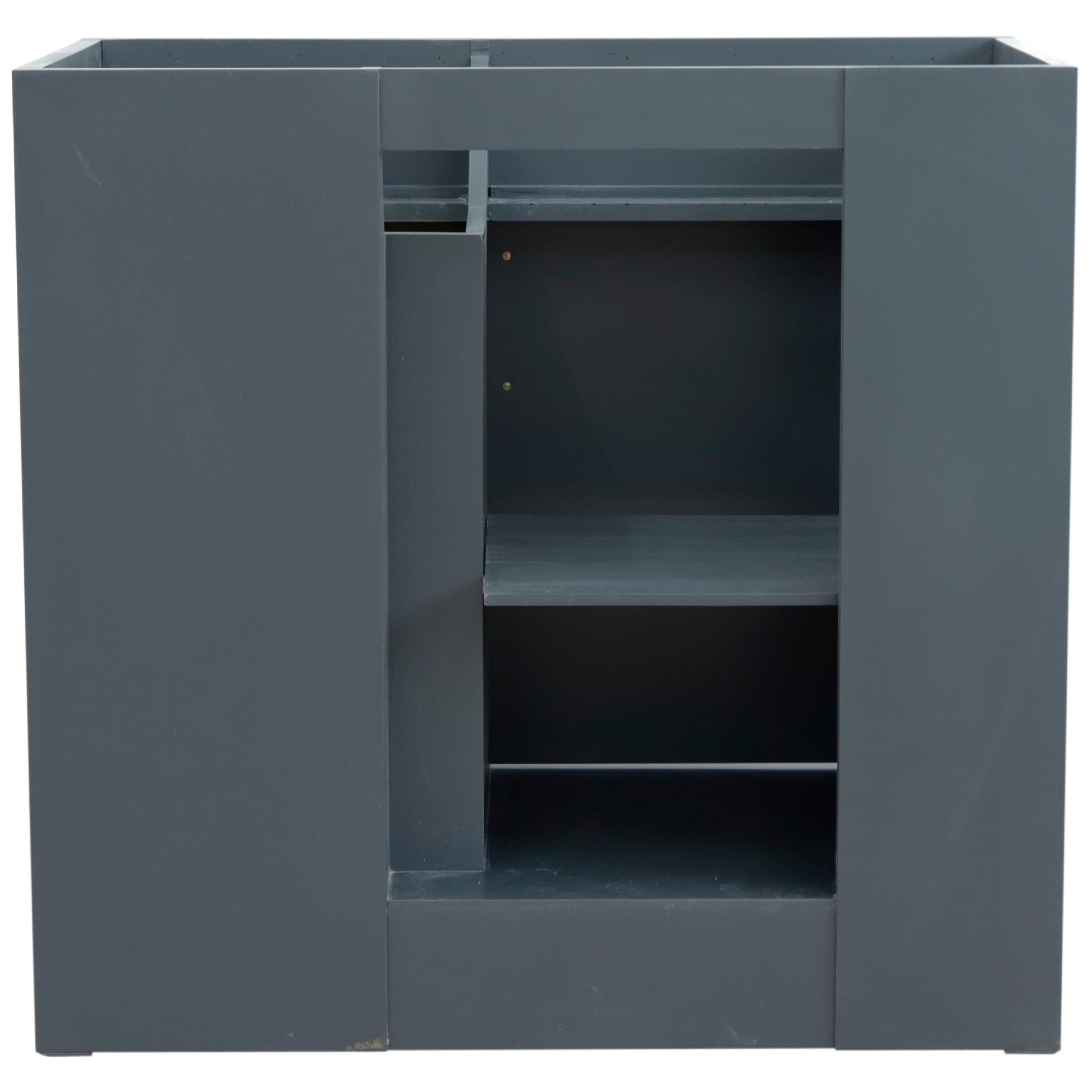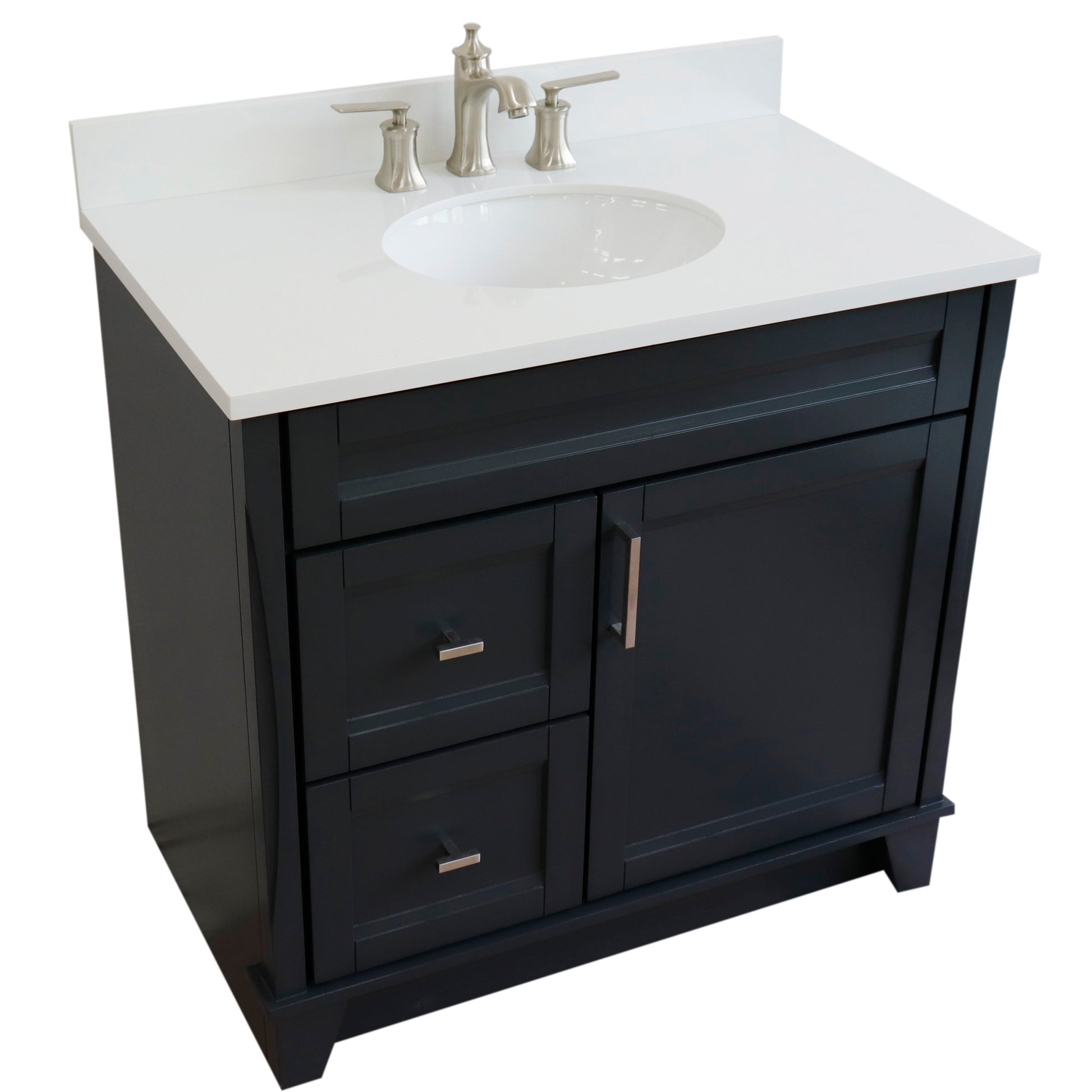 37" Single sink vanity in Dark Gray finish with White engineered stone and CENTER oval sink RIGHT drawers