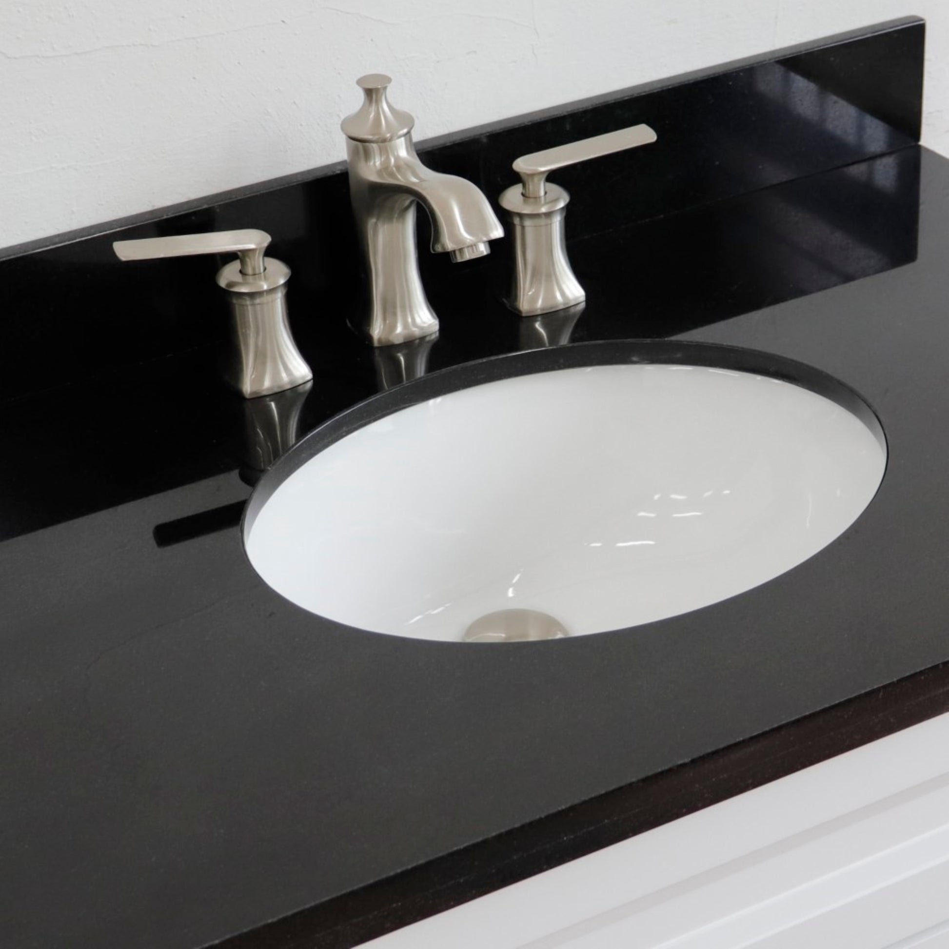 37" Single sink vanity in White finish with Black galaxy granite and CENTER oval sink RIGHT drawers