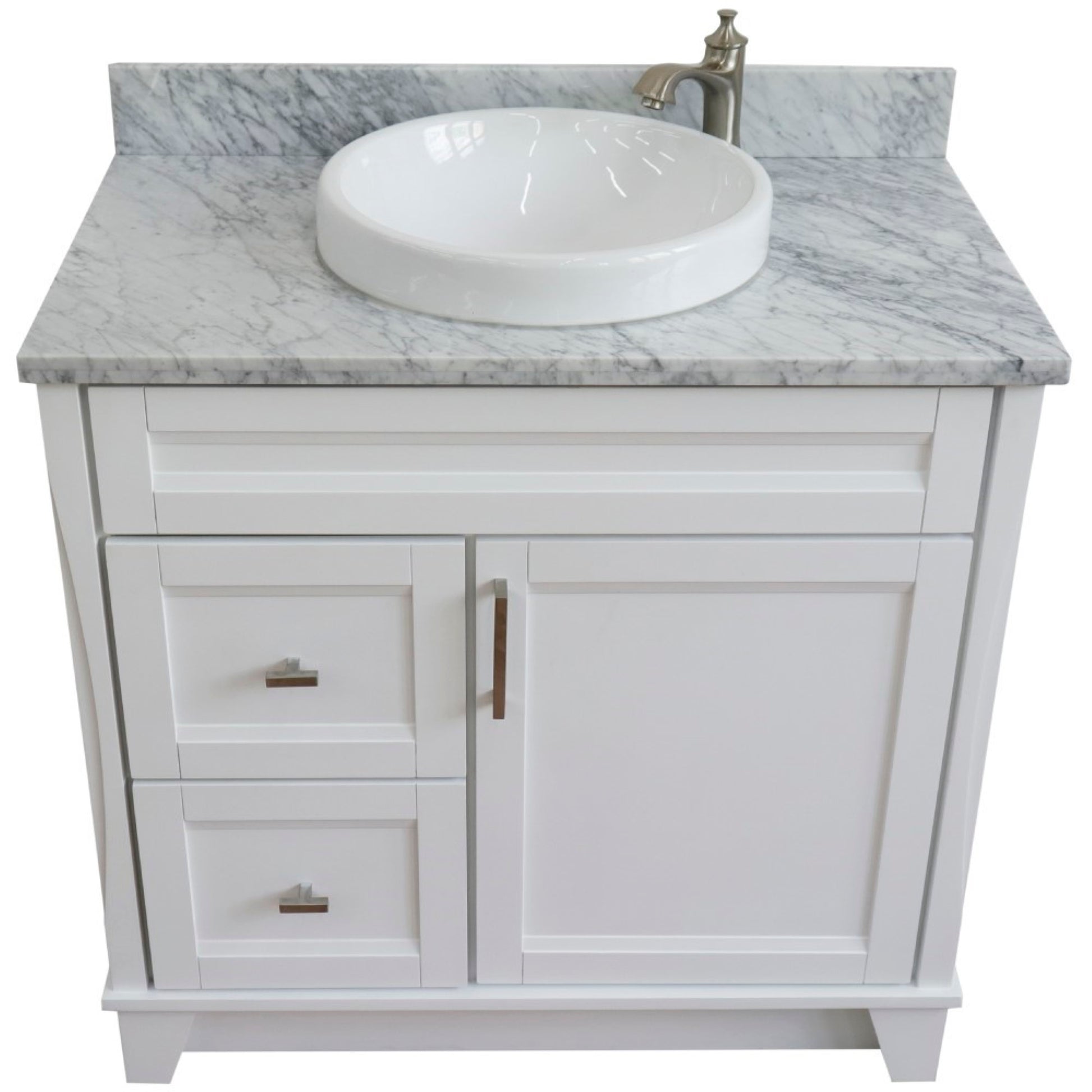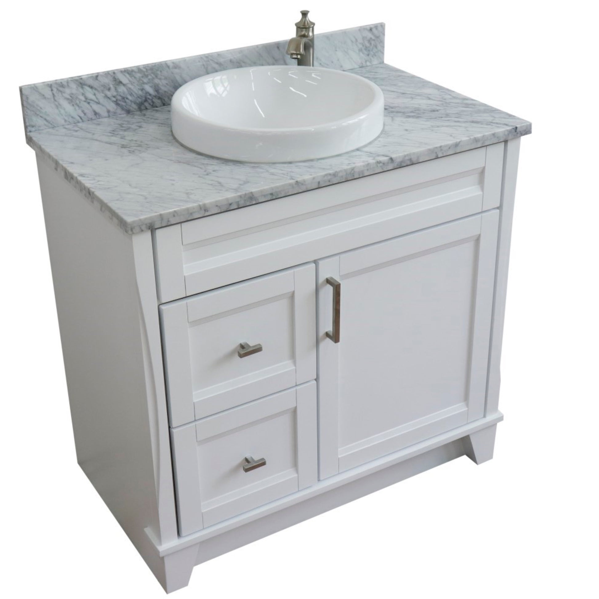 37" Single sink vanity in White finish with White Carrara marble and CENTER round sink RIGHT drawers