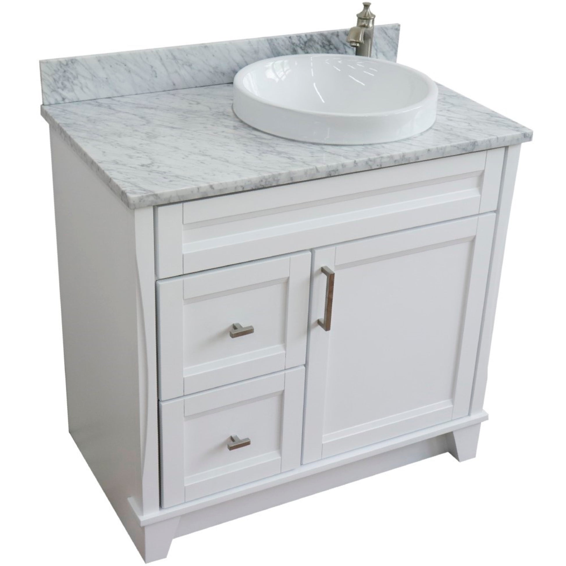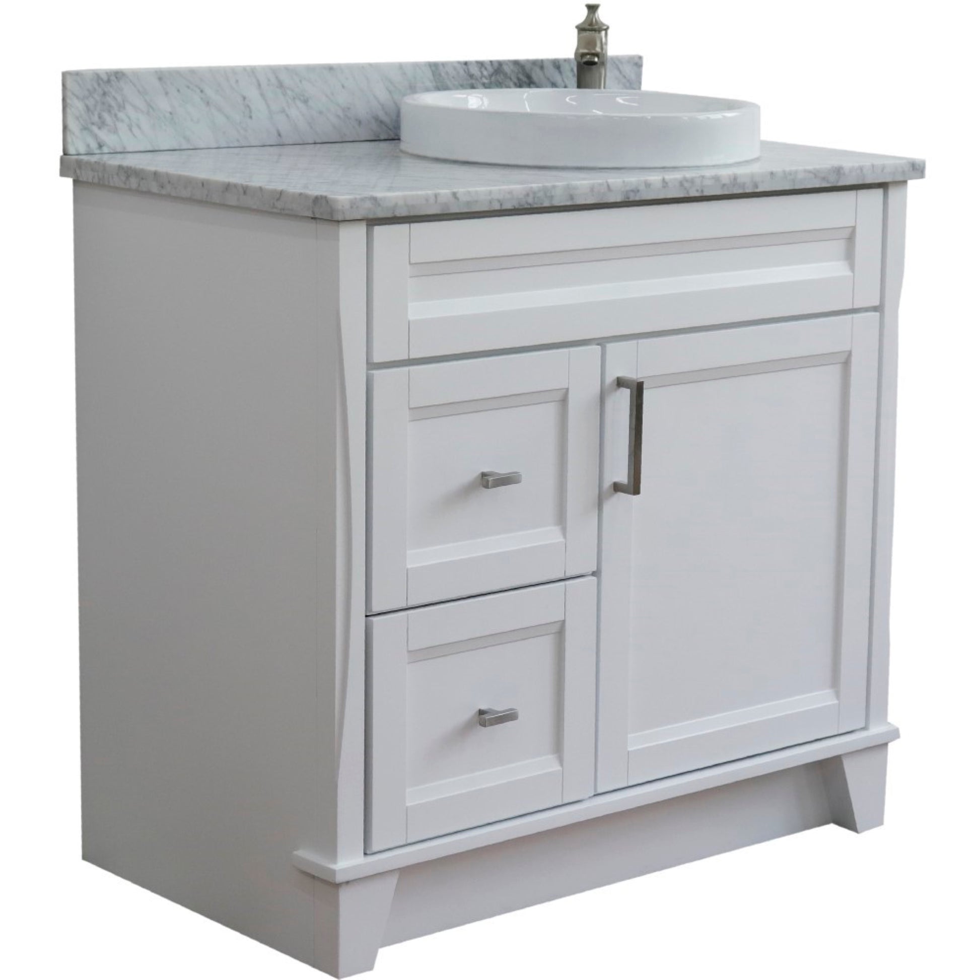 37" Single sink vanity in White finish with White Carrara marble and LEFT round sink RIGHT drawers