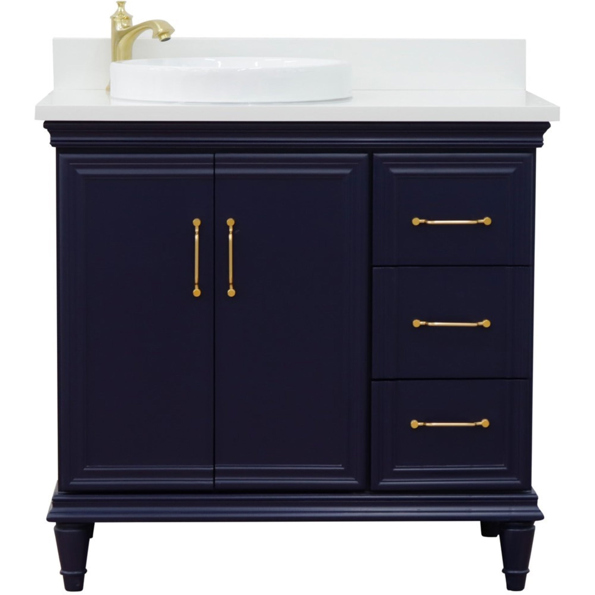 37" Single vanity in Blue finish with White engineered stone and round sink Left door/Left sink