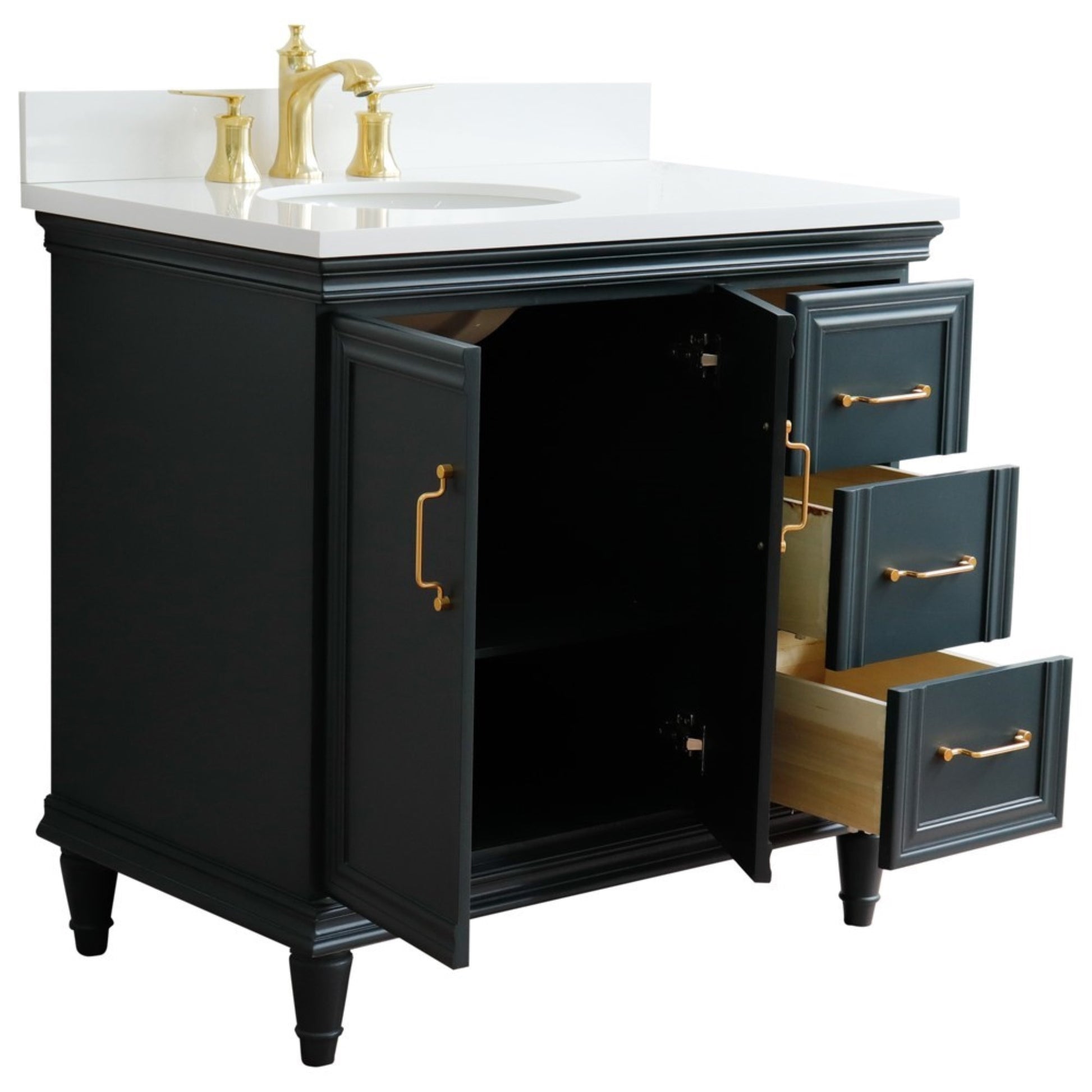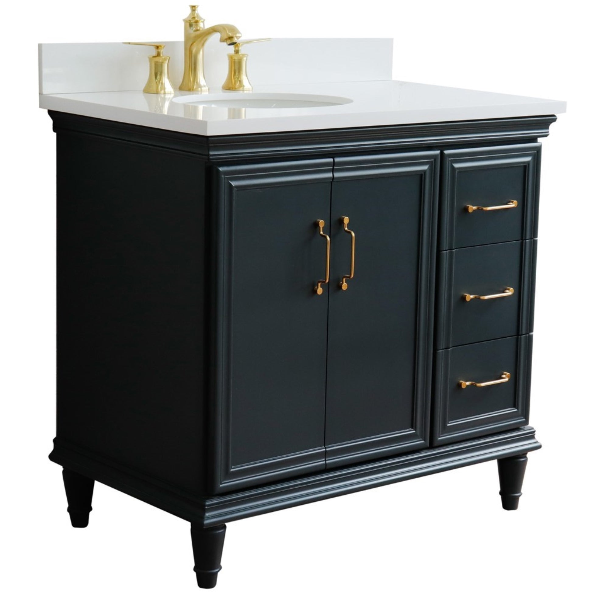 37" Single vanity in Dark Gray finish with White engineered stone and oval sink Left door/Left sink