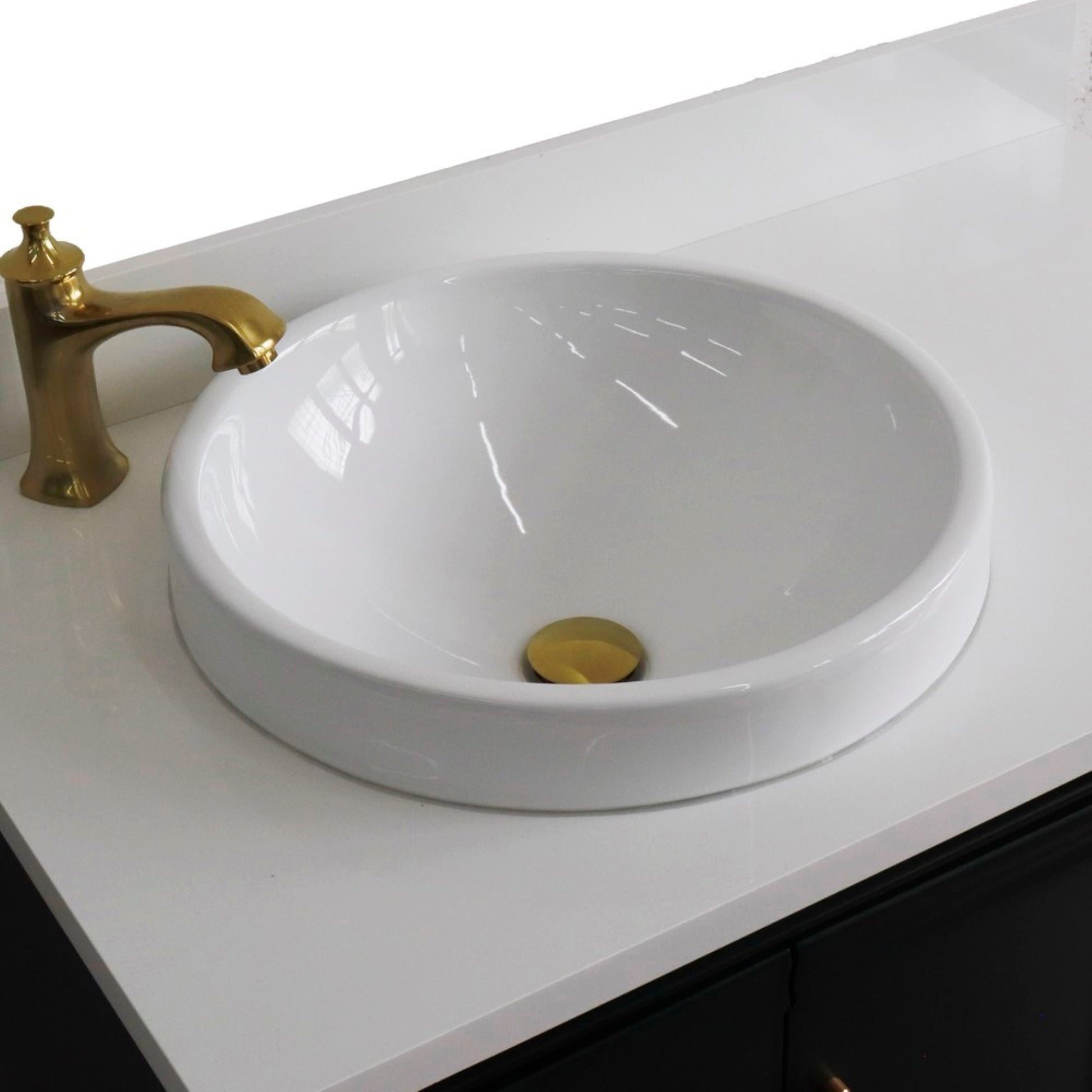 The Forli collection by Bellaterra Home features stunning bathroom vanities that can seamlessly integrate with any home design. The classic simplicity and elegance of this beautifully crafted piece of furniture will be the highly appreciated focal point in your bathroom. This vanity has three drawers and two cabinet doors that opens to a large ample storage space. The drawers are constructed with English dovetail and are installed with smooth full extension glides to provide durability. This vanity features gold finish hardware and a beautiful counter top that is pre-sealed and polished for added protection. The bathroom vanity top is preinstalled with a white cUPC certified ceramic sink.