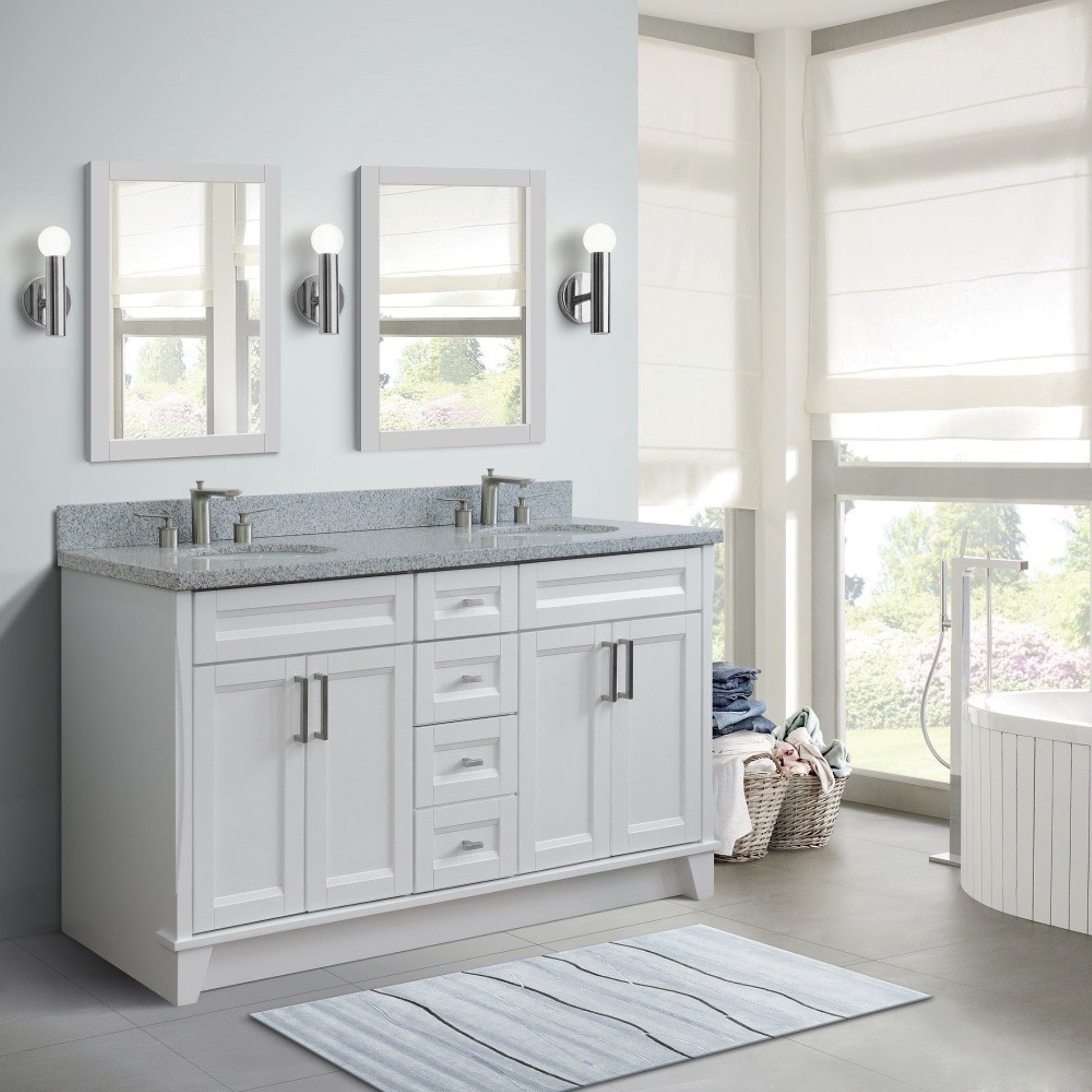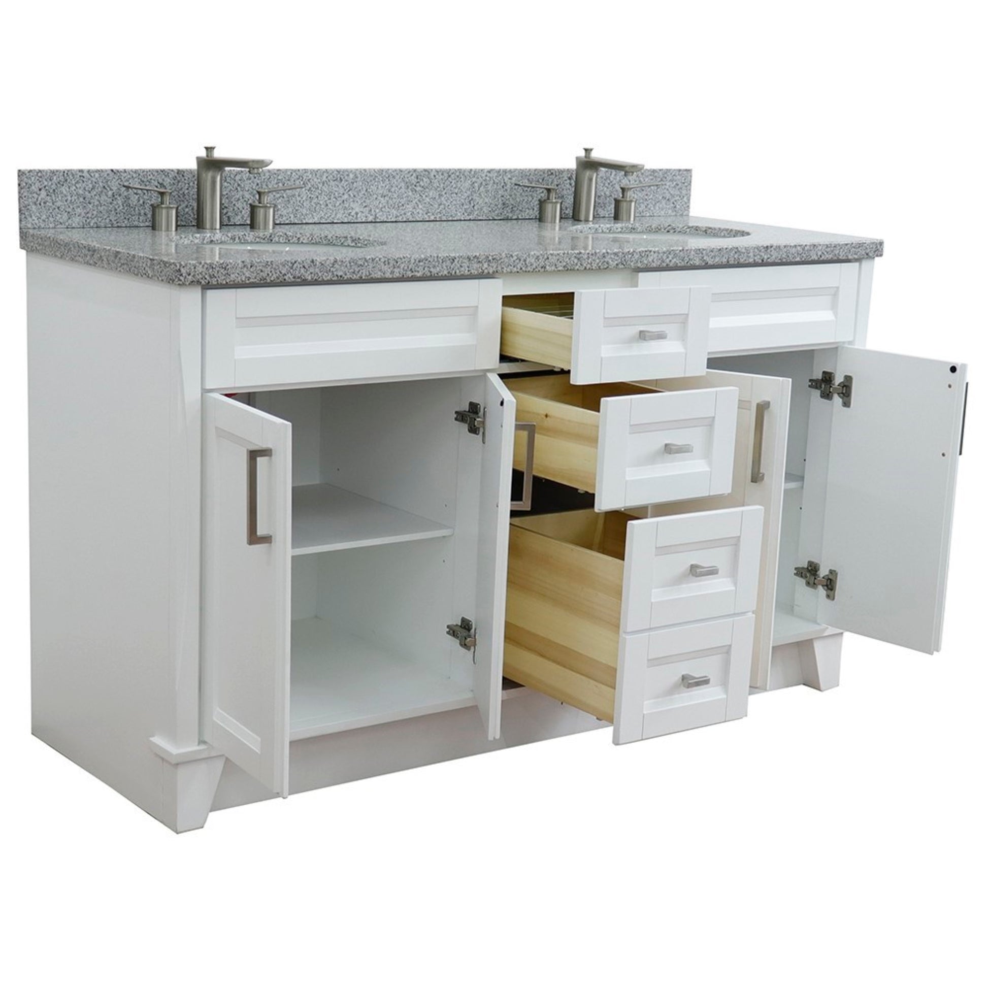 61" Double sink vanity in White finish and Gray granite and oval sink