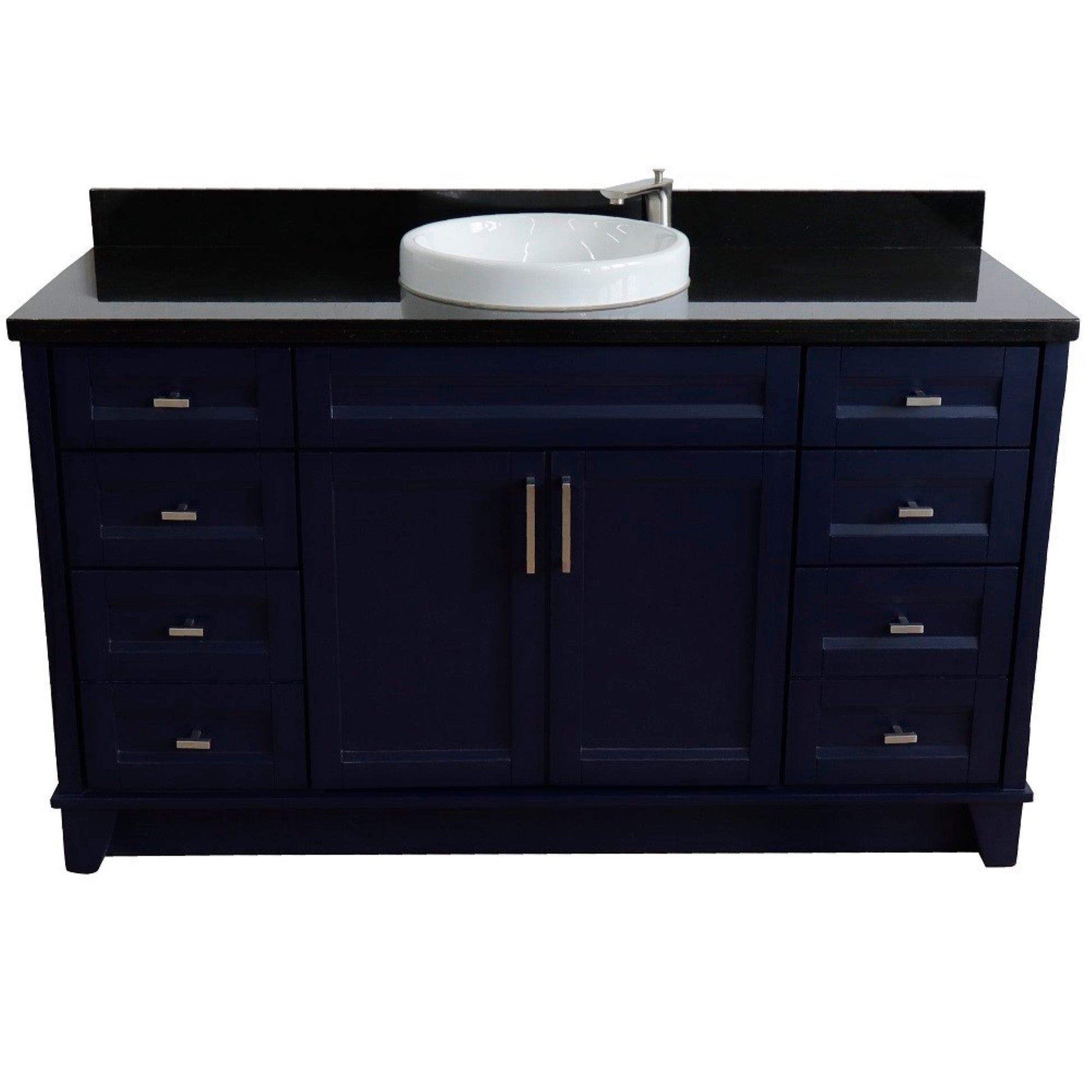 61" Single sink vanity in Blue finish and Black galaxy granite and round sink